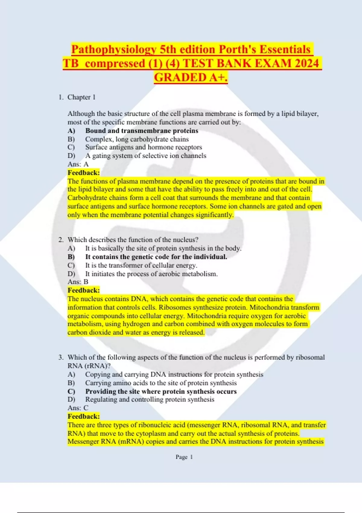 Pathophysiology 5th edition Porth's Essentials TB_compressed (1) (4) TEST BANK EXAM 2024 GRADED A+. 1.Chapter 1 Although the basic structure of the cell plasma membrane is formed by a lipid bilayer, most of the specific membrane functions are carried out by: A)Bound and transmembrane proteins B)Complex, long carbohydrate chains C)Surface antigens and hormone receptors D)A gating system of selective ion channels Ans: A Feedback: The functions of plasma membrane depend on the presence of proteins that are bound in the lipid bilayer and some that have the ability to pass freely into and out of the cell. Carbohydrate chains form a cell coat that surrounds the membrane and that contain surface antigens and surface hormone receptors. Some ion channels are gated and open only when the membrane potential changes significantly. 2.Which describes the function of the nucleus? A)It is basically the site of protein synthesis in the body. B)It contains the genetic code for the individual. C)It is the transformer of cellular energy. D)It initiates the process of aerobic metabolism. Ans: B Feedback: The nucleus contains DNA, which contains the genetic code that contains the information that controls cells. Ribosomes synthesize protein. Mitochondria transform organic compounds into cellular energy. Mitochondria require oxygen for aerobic metabolism, using hydrogen and carbon combined with oxygen molecules to form carbon dioxide and water as energy is released. 3.Which of the following aspects of the function of the nucleus is performed by ribosomal RNA (rRNA)? A)Copying and carrying DNA instructions for protein synthesis B)Carrying amino acids to the site of protein synthesis C)Providing the site where protein synthesis occurs D)Regulating and controlling protein synthesis Ans: C Feedback: There are three types of ribonucleic acid (messenger RNA, ribosomal RNA, and transfer RNA) that move to the cytoplasm and carry out the actual synthesis of proteins. Messenger RNA (mRNA) copies and carries the DNA instructions for protein synthesis to the cytoplasm; ribosomal RNA (rRNA) is the site of protein synthesis; and transfer RNA (tRNA) transports amino acids to the site of protein synthesis for incorporation into the protein being synthesized.