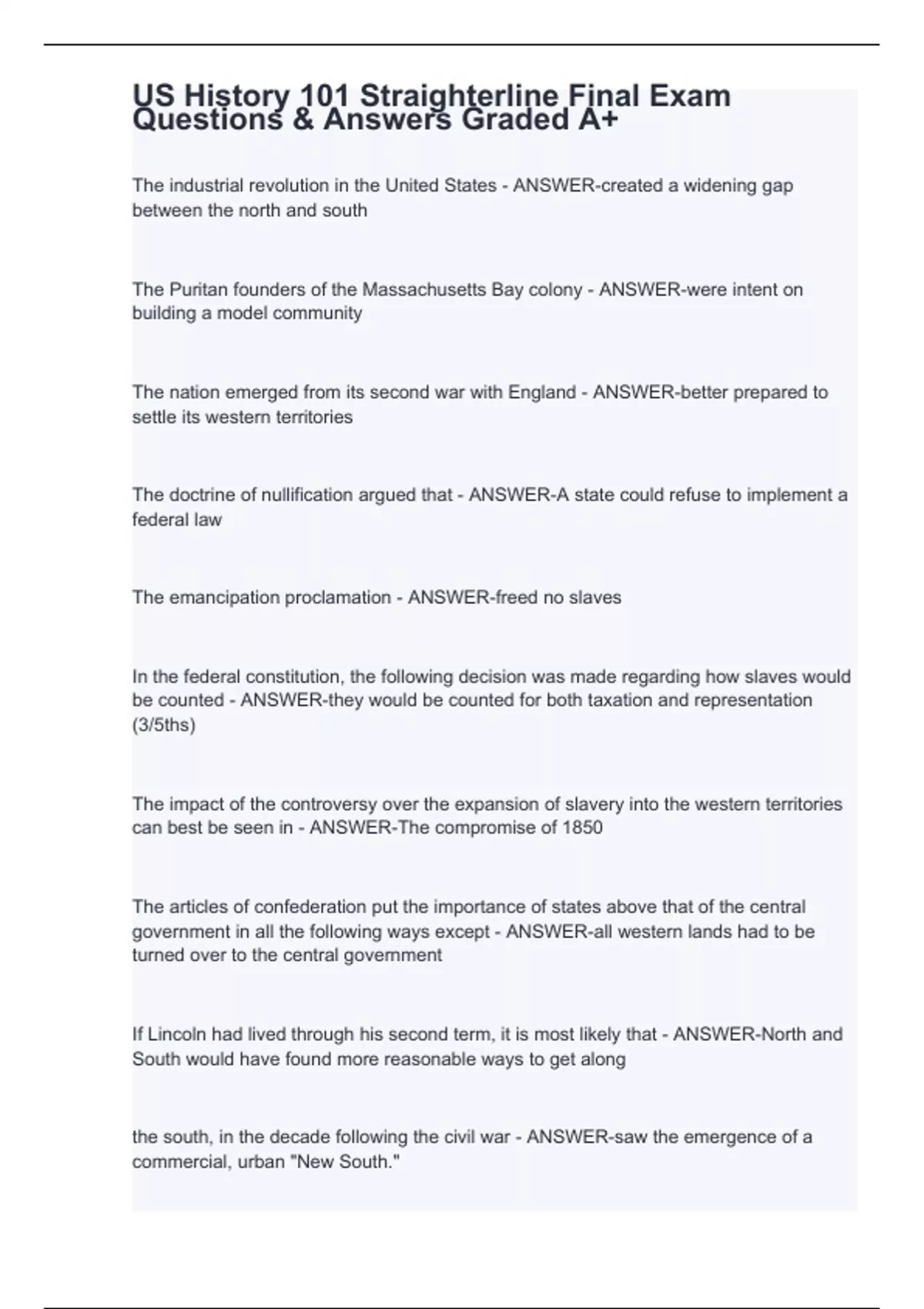 us history 101 straighterline final exam stuvia