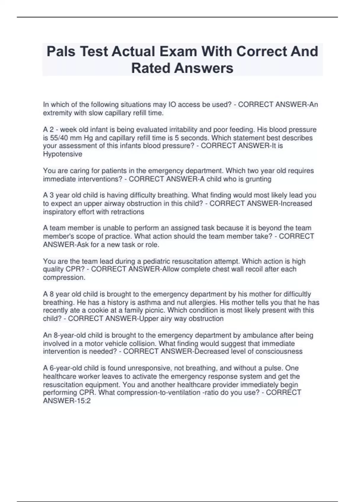 Pals Test Actual Exam With Correct And Rated Answers In which of the following situations may IO access be used? - CORRECT ANSWER-An extremity with slow capillary refill time. A 2 - week old infant is being evaluated irritability and poor feeding. His blood pressure is 55/40 mm Hg and capillary refill time is 5 seconds. Which statement best describes your assessment of this infants blood pressure? - CORRECT ANSWER-It is Hypotensive You are caring for patients in the emergency department. Which two year old requires immediate interventions? - CORRECT ANSWER-A child who is grunting A 3 year old child is having difficulty breathing. What finding would most likely lead you to expect an upper airway obstruction in this child? - CORRECT ANSWER-Increased inspiratory effort with retractions A team member is unable to perform an assigned task because it is beyond the team member's scope of practice. What action should the team member take? - CORRECT ANSWER-Ask for a new task or role. You are the team lead during a pediatric resuscitation attempt. Which action is high quality CPR? - CORRECT ANSWER-Allow complete chest wall recoil after each compression. A 8 year old child is brought to the emergency department by his mother for difficultly breathing. He has a history is asthma and nut allergies. His mother tells you that he has recently ate a cookie at a family picnic. Which condition is most likely present with this child? - CORRECT ANSWER-Upper airy way obstruction An 8-year-old child is brought to the emergency department by ambulance after being involved in a motor vehicle collision. What finding would suggest that immediate intervention is needed? - CORRECT ANSWER-Decreased level of consciousness A 6-year-old child is found unresponsive, not breathing, and without a pulse. One healthcare worker leaves to activate the emergency response system and get the resuscitation equipment. You and another healthcare provider immediately begin performing CPR. What compression-to-ventilation -ratio do you use? - CORRECT ANSWER-15:2