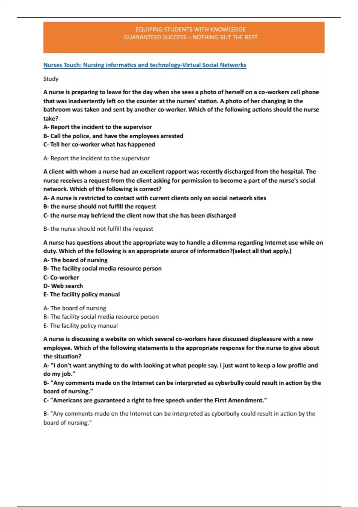 A nurse is preparing to leave for the day when she sees a photo of herself on a co-workers cell phone that was inadvertently left on the counter at the nurses' station. A photo of her changing in the bathroom was taken and sent by another co-worker. Which of the following actions should the nurse take? A- Report the incident to the supervisor B- Call the police, and have the employees arrested C- Tell her co-worker what has happened A- Report the incident to the supervisor A client with whom a nurse had an excellent rapport was recently discharged from the hospital. The nurse receives a request from the client asking for permission to become a part of the nurse's social network. Which of the following is correct? A- A nurse is restricted to contact with current clients only on social network sites B- the nurse should not fulfill the request C- the nurse may befriend the client now that she has been discharged B- the nurse should not fulfill the request A nurse has questions about the appropriate way to handle a dilemma regarding Internet use while on duty. Which of the following is an appropriate source of information?(select all that apply.) A- The board of nursing B- The facility social media resource person C- Co-worker D- Web search E- The facility policy manual A- The board of nursing B- The facility social media resource person E- The facility policy manual A nurse is discussing a website on which several co-workers have discussed displeasure with a new employee. Which of the following statements is the appropriate response for the nurse to give about the situation? A- "I don't want anything to do with looking at what people say. I just want to keep a low profile and do my job." B- "Any comments made on the Internet can be interpreted as cyberbully could result in action by the board of nursing." C- "Americans are guaranteed a right to free speech under the First Amendment." B- "Any comments made on the Internet can be interpreted as cyberbully could result in action by the board of nursing."