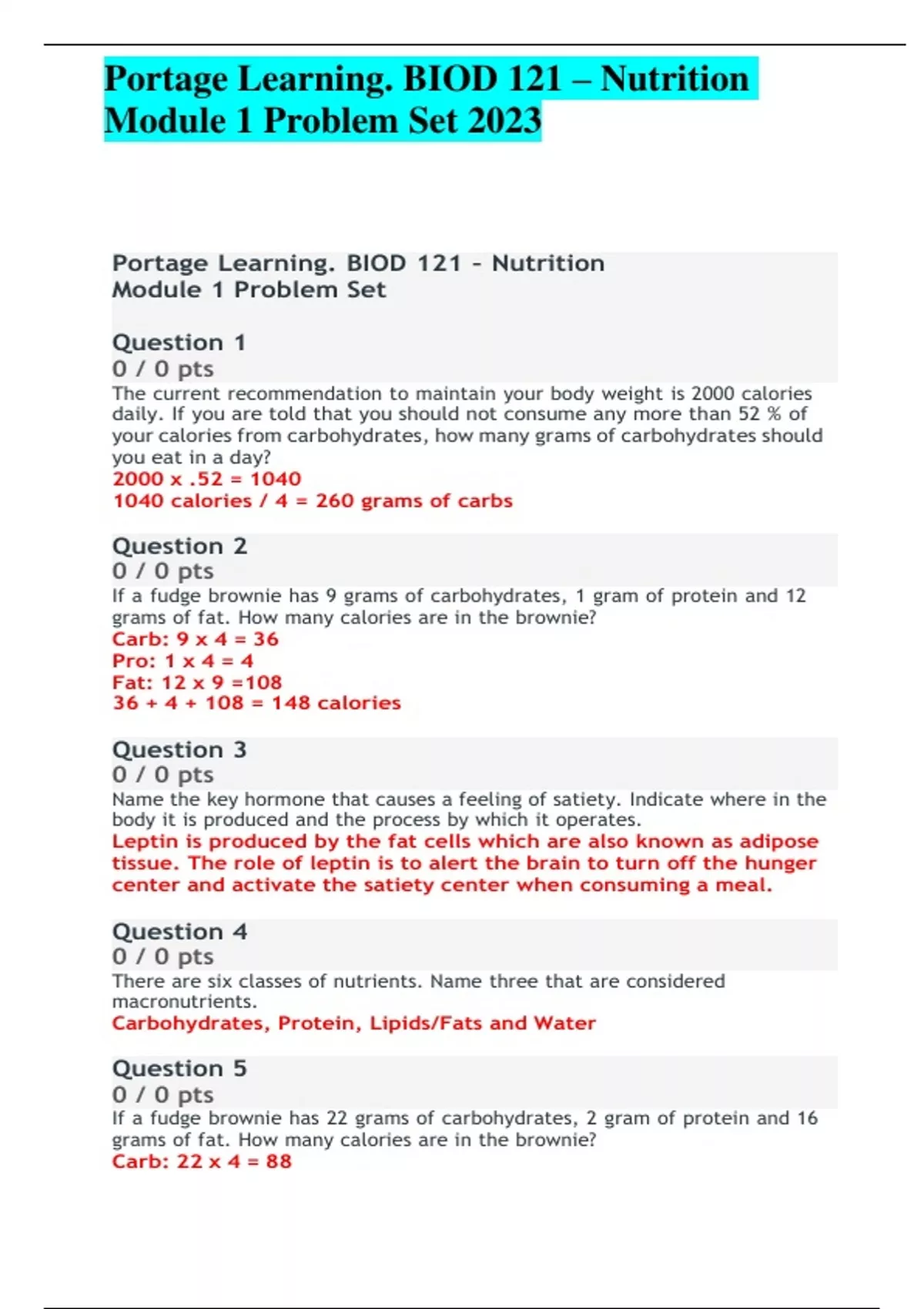 Portage Learning. BIOD 121 – Nutrition Module 1 Problem Set 2023