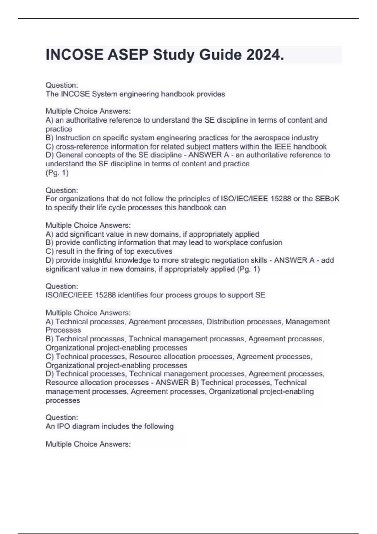 INCOSE ASEP Study Guide 2024. Question: The INCOSE System engineering handbook provides Multiple Choice Answers: A) an authoritative reference to understand the SE discipline in terms of content and practice B) Instruction on specific system engineering practices for the aerospace industry C) cross-reference information for related subject matters within the IEEE handbook D) General concepts of the SE discipline - ANSWER A - an authoritative reference to understand the SE discipline in terms of content and practice (Pg. 1) Question: For organizations that do not follow the principles of ISO/IEC/IEEE 15288 or the SEBoK to specify their life cycle processes this handbook can Multiple Choice Answers: A) add significant value in new domains, if appropriately applied B) provide conflicting information that may lead to workplace confusion C) result in the firing of top executives D) provide insightful knowledge to more strategic negotiation skills - ANSWER A - add significant value in new domains, if appropriately applied (Pg. 1) Question: ISO/IEC/IEEE 15288 identifies four process groups to support SE Multiple Choice Answers: A) Technical processes, Agreement processes, Distribution processes, Management Processes B) Technical processes, Technical management processes, Agreement processes, Organizational project-enabling processes C) Technical processes, Resource allocation processes, Agreement processes, Organizational project-enabling processes D) Technical processes, Technical management processes, Agreement processes, Resource allocation processes - ANSWER B) Technical processes, Technical management processes, Agreement processes, Organizational project-enabling processes Question: An IPO diagram includes the following Multiple Choice Answers: