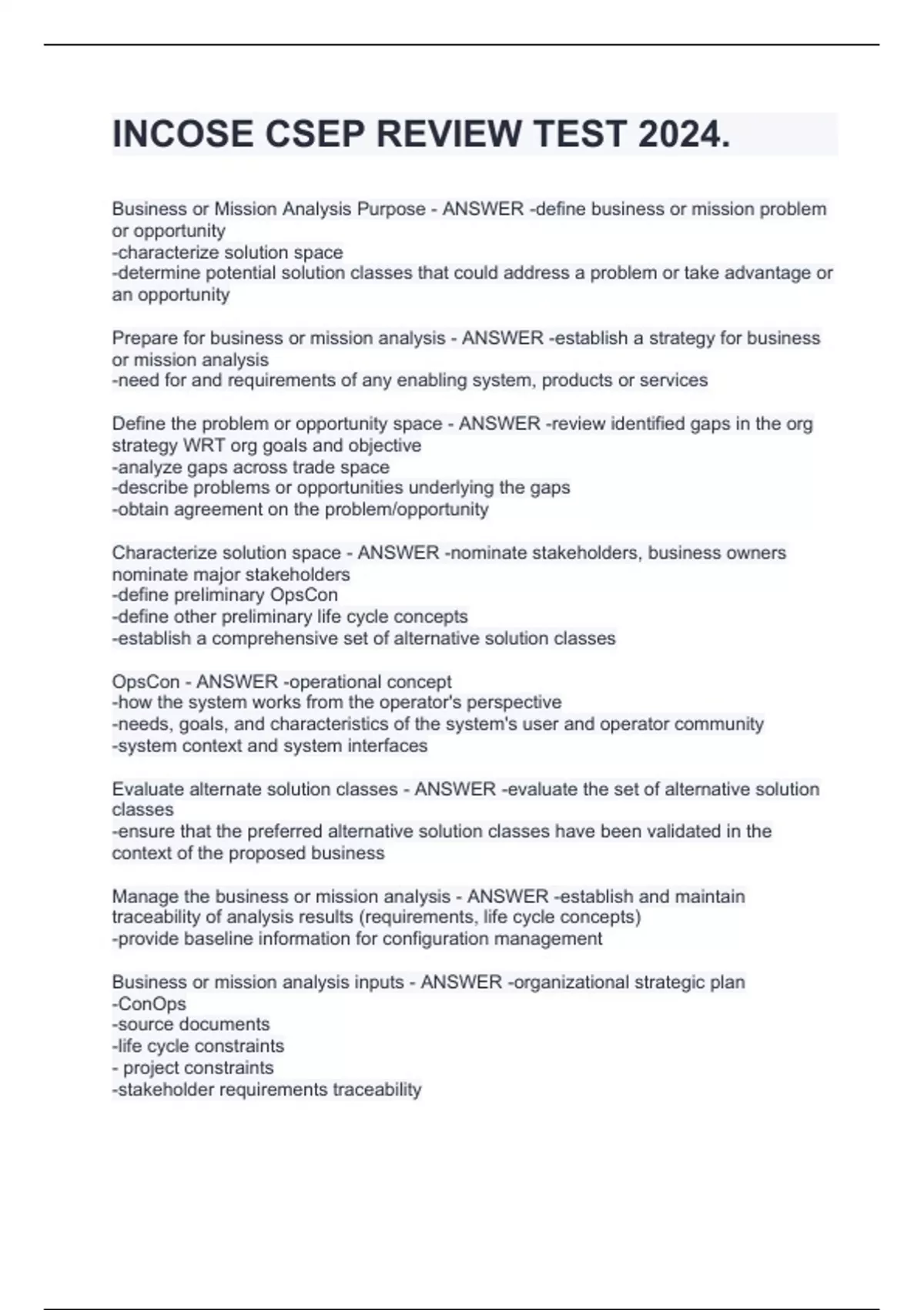 INCOSE CSEP REVIEW TEST 2024. Business or Mission Analysis Purpose - ANSWER -define business or mission problem or opportunity -characterize solution space -determine potential solution classes that could address a problem or take advantage or an opportunity Prepare for business or mission analysis - ANSWER -establish a strategy for business or mission analysis -need for and requirements of any enabling system, products or services Define the problem or opportunity space - ANSWER -review identified gaps in the org strategy WRT org goals and objective -analyze gaps across trade space -describe problems or opportunities underlying the gaps -obtain agreement on the problem/opportunity Characterize solution space - ANSWER -nominate stakeholders, business owners nominate major stakeholders -define preliminary OpsCon -define other preliminary life cycle concepts -establish a comprehensive set of alternative solution classes OpsCon - ANSWER -operational concept -how the system works from the operator's perspective -needs, goals, and characteristics of the system's user and operator community -system context and system interfaces Evaluate alternate solution classes - ANSWER -evaluate the set of alternative solution classes -ensure that the preferred alternative solution classes have been validated in the context of the proposed business Manage the business or mission analysis - ANSWER -establish and maintain traceability of analysis results (requirements, life cycle concepts) -provide baseline information for configuration management Business or mission analysis inputs - ANSWER -organizational strategic plan -ConOps -source documents -life cycle constraints - project constraints -stakeholder requirements traceability