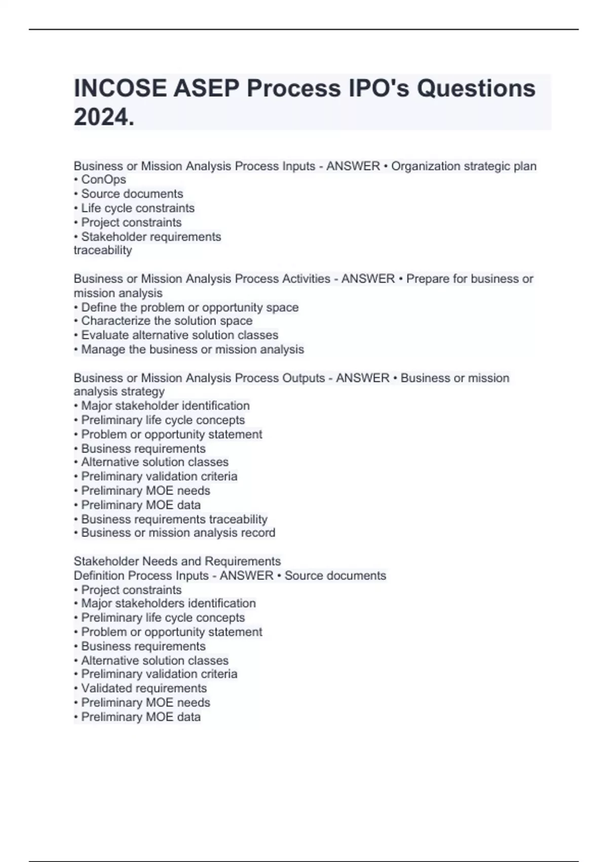 INCOSE ASEP Process IPO's Questions 2024. Business or Mission Analysis Process Inputs - ANSWER • Organization strategic plan • ConOps • Source documents • Life cycle constraints • Project constraints • Stakeholder requirements traceability Business or Mission Analysis Process Activities - ANSWER • Prepare for business or mission analysis • Define the problem or opportunity space • Characterize the solution space • Evaluate alternative solution classes • Manage the business or mission analysis Business or Mission Analysis Process Outputs - ANSWER • Business or mission analysis strategy • Major stakeholder identification • Preliminary life cycle concepts • Problem or opportunity statement • Business requirements • Alternative solution classes • Preliminary validation criteria • Preliminary MOE needs • Preliminary MOE data • Business requirements traceability • Business or mission analysis record Stakeholder Needs and Requirements Definition Process Inputs - ANSWER • Source documents • Project constraints • Major stakeholders identification • Preliminary life cycle concepts • Problem or opportunity statement • Business requirements • Alternative solution classes • Preliminary validation criteria • Validated requirements • Preliminary MOE needs • Preliminary MOE data