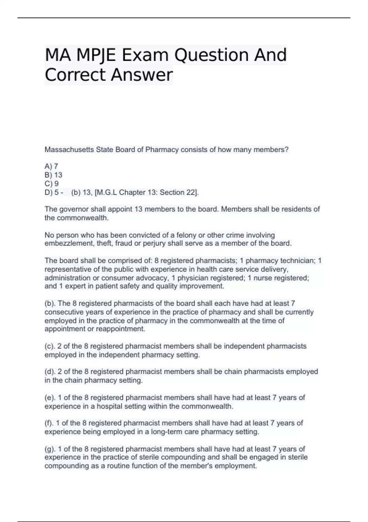 MA MPJE Exam Question And Correct Answer Massachusetts State Board of Pharmacy consists of how many members? A) 7 B) 13 C) 9 D) 5 - (b) 13, [M.G.L Chapter 13: Section 22]. The governor shall appoint 13 members to the board. Members shall be residents of the commonwealth. No person who has been convicted of a felony or other crime involving embezzlement, theft, fraud or perjury shall serve as a member of the board. The board shall be comprised of: 8 registered pharmacists; 1 pharmacy technician; 1 representative of the public with experience in health care service delivery, administration or consumer advocacy, 1 physician registered; 1 nurse registered; and 1 expert in patient safety and quality improvement. (b). The 8 registered pharmacists of the board shall each have had at least 7 consecutive years of experience in the practice of pharmacy and shall be currently employed in the practice of pharmacy in the commonwealth at the time of appointment or reappointment. (c). 2 of the 8 registered pharmacist members shall be independent pharmacists employed in the independent pharmacy setting. (d). 2 of the 8 registered pharmacist members shall be chain pharmacists employed in the chain pharmacy setting. (e). 1 of the 8 registered pharmacist members shall have had at least 7 years of experience in a hospital setting within the commonwealth. (f). 1 of the 8 registered pharmacist members shall have had at least 7 years of experience being employed in a long-term care pharmacy setting. (g). 1 of the 8 registered pharmacist members shall have had at least 7 years of experience in the practice of sterile compounding and shall be engaged in sterile compounding as a routine function of the member's employment. (h). 1 of the 8 registered pharmacist members shall be employed in an academic or scholarly position related to the practice of pharmacy with an institution of higher learning licensed by the commonwealth. (j). the pharmacy technician membe According to Massachusetts Pharmacy Law, a written prescription for a controlled substance in Schedule II shall become invalid SIX months after the date of issuance. A) True B) False - (b) False, [Massachusetts Controlled Substance Act Chapter 94C: Section 23(a)]. According to Massachusetts Pharmacy Law, a written prescription for a controlled substance in Schedule II shall become invalid THIRTY DAYS (30) after the date of issuance. A written prescription for a controlled substance in Schedule II shall not be refilled and shall be kept in a separate file. The pharmacist filling a written prescription for a controlled substance in Schedule II shall endorse his own signature on the face thereof. Which of the following information IS/ARE TRUE about voluntary non-opiate directive form? I. The form shall indicate to all practitioners that an individual shall not be administered or offered a prescription or medication order for an opiate. II. An individual may execute and file a voluntary non-opiate directive form with a registered practitioner or other authority authorized by the secretary to accept the voluntary non-opiate directive form for filing. III. An individual may revoke the voluntary non-opiate directive form for any reason and may do so by written or oral means. A) I only B) I and II only C) II and III only D) All of the above - (d) All, [Massachusetts Controlled Substance Act Chapter 94C: Section 18B]. (a). The department shall establish a voluntary non-opiate directive form. The form shall indicate to all practitioners that an individual shall not be administered or offered a prescription or medication order for an opiate.