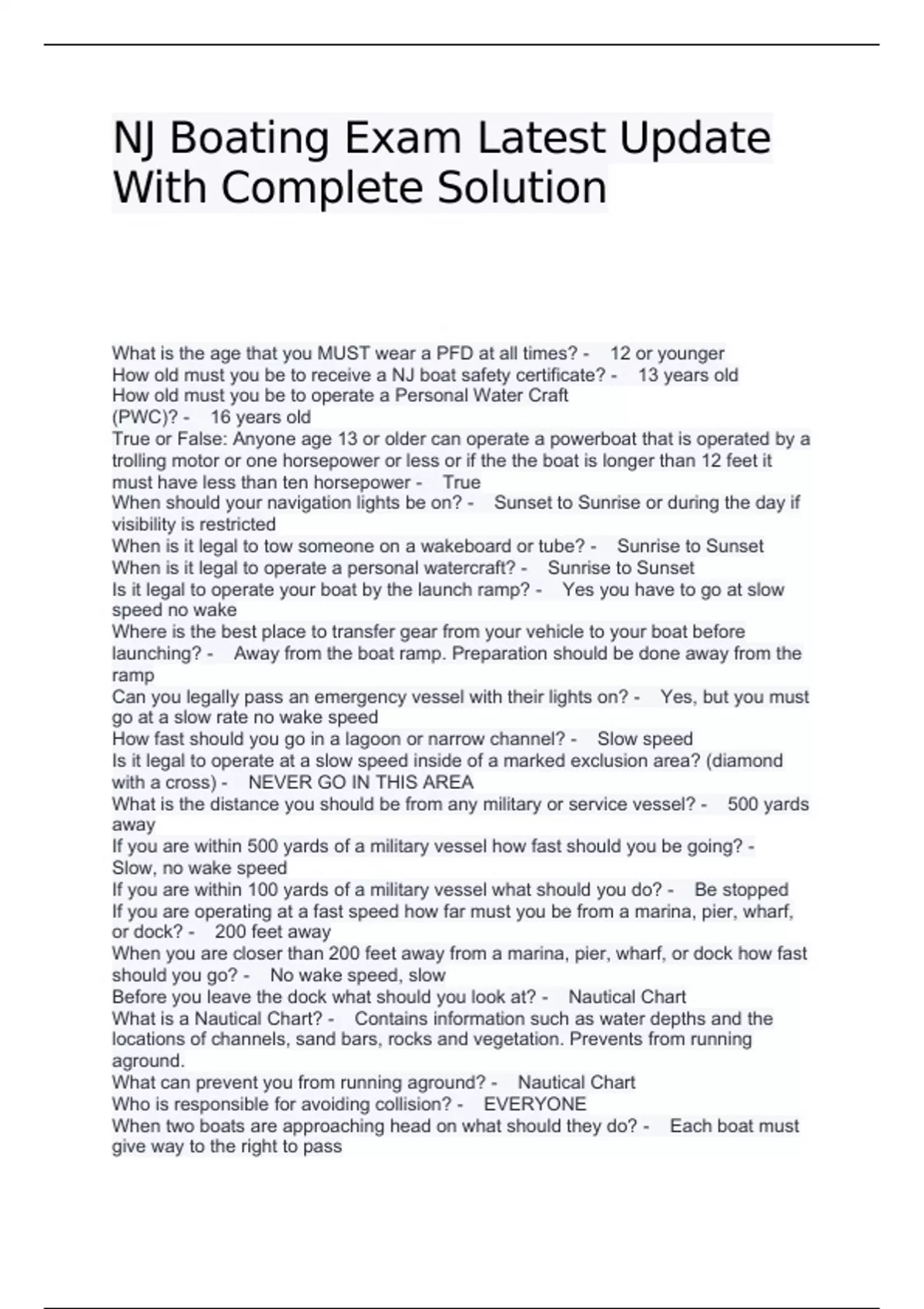 NJ Boating Exam Latest Update With Complete Solution What is the age that you MUST wear a PFD at all times? - 12 or younger How old must you be to receive a NJ boat safety certificate? - 13 years old How old must you be to operate a Personal Water Craft (PWC)? - 16 years old True or False: Anyone age 13 or older can operate a powerboat that is operated by a trolling motor or one horsepower or less or if the the boat is longer than 12 feet it must have less than ten horsepower - True When should your navigation lights be on? - Sunset to Sunrise or during the day if visibility is restricted When is it legal to tow someone on a wakeboard or tube? - Sunrise to Sunset When is it legal to operate a personal watercraft? - Sunrise to Sunset Is it legal to operate your boat by the launch ramp? - Yes you have to go at slow speed no wake Where is the best place to transfer gear from your vehicle to your boat before launching? - Away from the boat ramp. Preparation should be done away from the ramp Can you legally pass an emergency vessel with their lights on? - Yes, but you must go at a slow rate no wake speed How fast should you go in a lagoon or narrow channel? - Slow speed Is it legal to operate at a slow speed inside of a marked exclusion area? (diamond with a cross) - NEVER GO IN THIS AREA What is the distance you should be from any military or service vessel? - 500 yards away If you are within 500 yards of a military vessel how fast should you be going? - Slow, no wake speed If you are within 100 yards of a military vessel what should you do? - Be stopped If you are operating at a fast speed how far must you be from a marina, pier, wharf, or dock? - 200 feet away When you are closer than 200 feet away from a marina, pier, wharf, or dock how fast should you go? - No wake speed, slow Before you leave the dock what should you look at? - Nautical Chart What is a Nautical Chart? - Contains information such as water depths and the locations of channels, sand bars, rocks and vegetation. Prevents from running aground. What can prevent you from running aground? - Nautical Chart Who is responsible for avoiding collision? - EVERYONE When two boats are approaching head on what should they do? - Each boat must give way to the right to pass