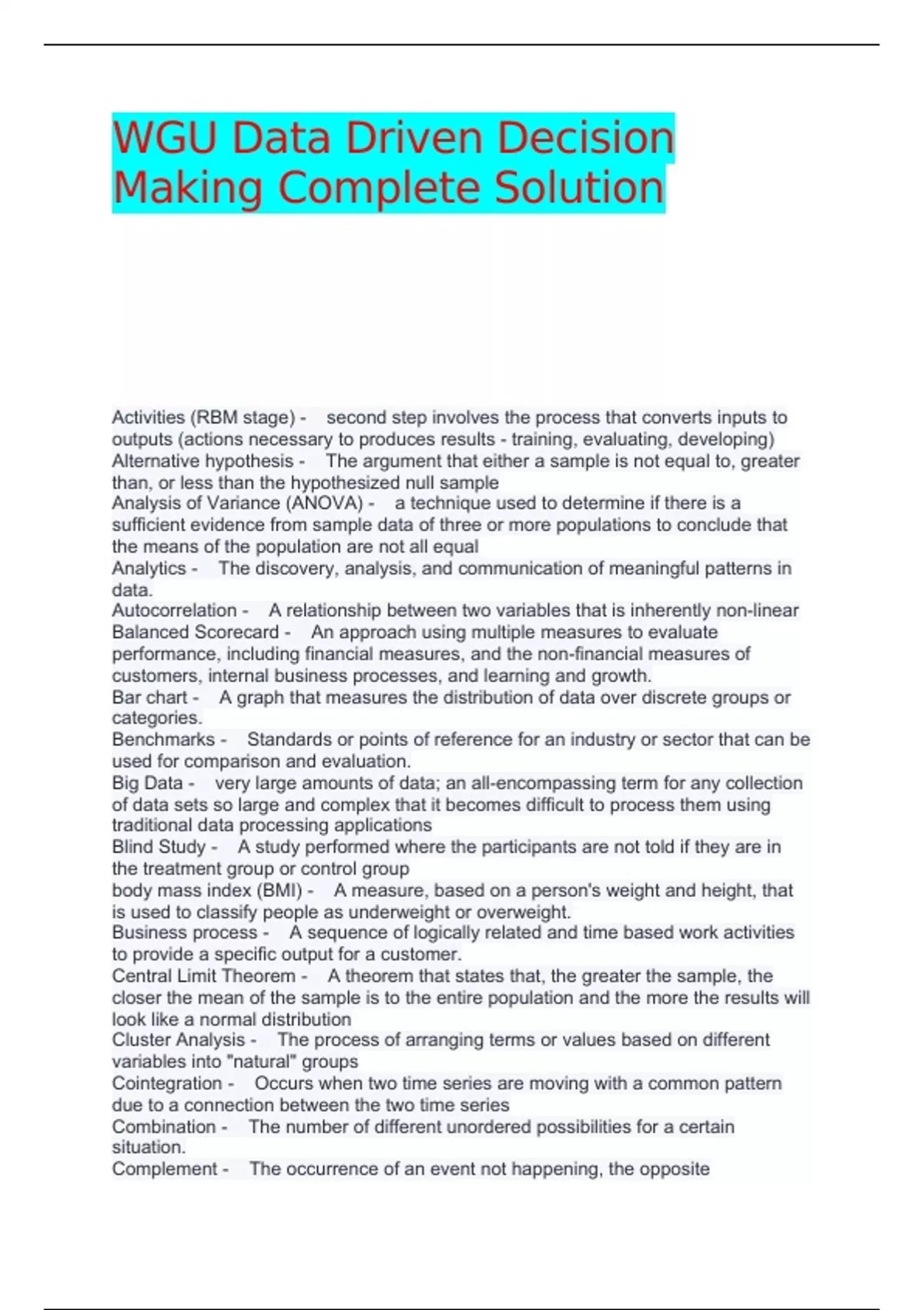 WGU Data Driven Decision Making Complete Solution Activities (RBM stage) - second step involves the process that converts inputs to outputs (actions necessary to produces results - training, evaluating, developing) Alternative hypothesis - The argument that either a sample is not equal to, greater than, or less than the hypothesized null sample Analysis of Variance (ANOVA) - a technique used to determine if there is a sufficient evidence from sample data of three or more populations to conclude that the means of the population are not all equal Analytics - The discovery, analysis, and communication of meaningful patterns in data. Autocorrelation - A relationship between two variables that is inherently non-linear Balanced Scorecard - An approach using multiple measures to evaluate performance, including financial measures, and the non-financial measures of customers, internal business processes, and learning and growth. Bar chart - A graph that measures the distribution of data over discrete groups or categories. Benchmarks - Standards or points of reference for an industry or sector that can be used for comparison and evaluation. Big Data - very large amounts of data; an all-encompassing term for any collection of data sets so large and complex that it becomes difficult to process them using traditional data processing applications Blind Study - A study performed where the participants are not told if they are in the treatment group or control group body mass index (BMI) - A measure, based on a person's weight and height, that is used to classify people as underweight or overweight. Business process - A sequence of logically related and time based work activities to provide a specific output for a customer. Central Limit Theorem - A theorem that states that, the greater the sample, the closer the mean of the sample is to the entire population and the more the results will look like a normal distribution Cluster Analysis - The process of arranging terms or values based on different variables into "natural" groups Cointegration - Occurs when two time series are moving with a common pattern due to a connection between the two time series Combination - The number of different unordered possibilities for a certain situation. Complement - The occurrence of an event not happening, the opposite Confidence interval - An interval estimate used to indicate reliability Continuous Data - Data that can lay along any point in a range of data Control chart - A graphic display of process data over time and against established control limits, and that has a centerline that assists in detecting a trend of plotted values toward either control limit. Control limits - The area composed of three standard deviations on either side of the centerline, or mean, of a normal distribution of data plotted on a control chart that reflects the expected variation in the data Criterion-reference test - compare an individual to certain defined standards Critical Success Factors - The important things an entity must do to be successful, such as quality measures, customer service, or efficiency. Cumulative Average-Time Learning Model - A learning curve model in which the cumulative average time per unit declines by a constant percentage each time the cumulative quantity of units produced is doubled Cumulative distributions - The probability that a random variable will be found at a value less than or equal to a given number Customer satisfaction - A measure of the extent to which customers are satisfied with the products and related services they received from a supplier. Cycle time - The total elapsed time to move a unit of work from the beginning to the end of a physical process, as defined by the producer and the customer. Cyclicality - Repetition of up (peaks) or down movements (troughs) that follow or counteract a business cycle that can last several years Data Management - The management, including cleaning and storage, of collected data. Data Mining - the process of discovering patterns in large data sets; performed on big data to decipher patterns from these large databases Data Set - A collection of related data records on a storage device. Davenport Kim Three Stage Model - A decision making model developed by Thomas Davenport and Jinho Kim that consists of three stages: framing the problem, solving the problem, and communicating results Dependent Variable - The variable whose value depends on one or more variables in the equation; typically the cost or activity to be predicted Detractor - A category of customer used in the calculation of the Net Promoter Score that indicates an unhappy customer. Discrete Data - Data that can only take on whole values and has clear boundaries Double Blind Study - A study performed where neither the treatment allocator nor the participant knows which group the participant is in Economic Value Added (EVA) - Net income (after taxes) earned in excess of the amount of net income required to earn the company's cost of capital. Epidemiology - study of the incidence, distribution and possible control of diseases and other factors relating to health Event - An outcome that occurs Experience Curve - A curve that shows the decline in cost per unit in various business functions of the value chain as the amount of these activities increases Heteroscedasticity - A regression in which the variances in y for the values of x are not equal Histogram - A graph that displays continuous data. This type of graph has vertical bars that show the counts or numbers in each range of data. Homoscedasticity - A regression in which the variances in y for the values of x are equal or close to equal