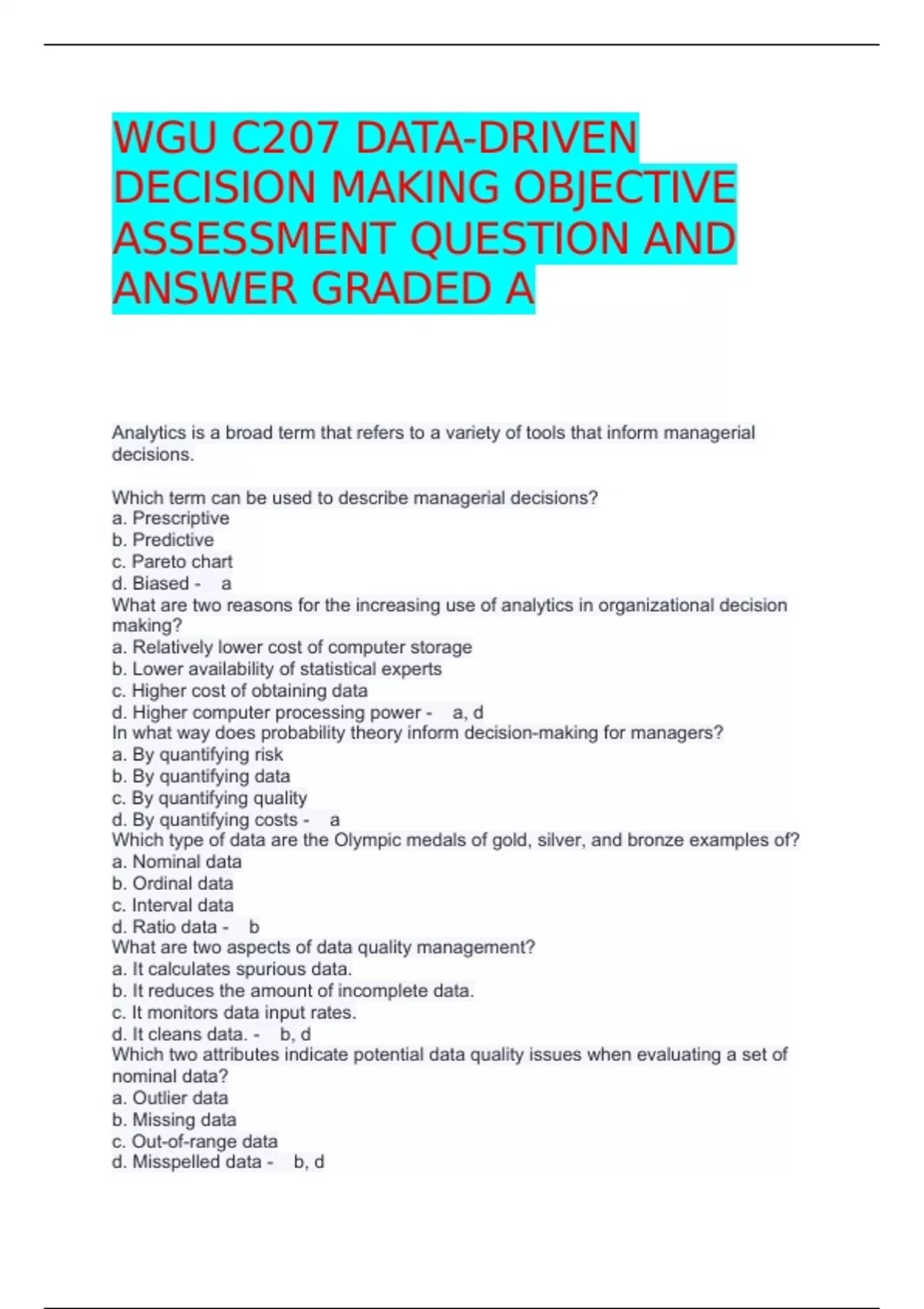 WGU C207 DATA-DRIVEN DECISION MAKING OBJECTIVE ASSESSMENT QUESTION AND ANSWER GRADED A Analytics is a broad term that refers to a variety of tools that inform managerial decisions. Which term can be used to describe managerial decisions? a. Prescriptive b. Predictive c. Pareto chart d. Biased - a What are two reasons for the increasing use of analytics in organizational decision making? a. Relatively lower cost of computer storage b. Lower availability of statistical experts c. Higher cost of obtaining data d. Higher computer processing power - a, d In what way does probability theory inform decision-making for managers? a. By quantifying risk b. By quantifying data c. By quantifying quality d. By quantifying costs - a Which type of data are the Olympic medals of gold, silver, and bronze examples of? a. Nominal data b. Ordinal data c. Interval data d. Ratio data - b What are two aspects of data quality management? a. It calculates spurious data. b. It reduces the amount of incomplete data. c. It monitors data input rates. d. It cleans data. - b, d Which two attributes indicate potential data quality issues when evaluating a set of nominal data? a. Outlier data b. Missing data c. Out-of-range data d. Misspelled data - b, d When conducting a study that measures an individual's weight, all scales are calibrated prior to use in measurement. Which type of error should this procedure significantly reduce? a. Systematic error b. Omission error c. Random error d. Information error - a An advertising manager creates a research study by presenting low, medium, or high frequency of the same ad in matched markets. The manager then reports on sales in each market location. What is the term for the different sales in this study? a. The experimental unit b. The treatment c. The response variable d. The intervention - c A healthcare study follows a particular sample over time to identify how the health habits of teenagers impact their likelihood of acquiring various diseases later in their life in the hope that the healthcare organization will be able to create early prevention programs. Which type of research design does this study describe? a. Double blind study b. Systematic study c. Cohort study d. Experimental study - c Several missing values in a particular field in a dataset were observed. The likelihood of a record having a missing value is correlated to another variable in the dataset. Which two types of error might be introduced into the dataset if the removed record included missing values? a. Systematic error b. Omission error c. Random error d. Typographical error - a, b A company is trying to increase its online sales revenue by improving its e-mail advertising campaign for repeat customers as well as new customers. Which two variables would be used in determining a campaign to maximize revenue gain? a. Number of purchases per e-mail b. E-mail content c. Spending per purchase d. Cost per e-mail - a, c This statistical procedure compares outcomes of different drug testing results a. Anova b. Correlation c. Control Charts - a This statistical procedure is used to help understand effective marketing and to spend advertising dollars efficiently a. Anova b. Correlation c. Control Charts - b This statistical procedure monitors production process a. Anova b. Correlation c. Control Charts - c A researcher concludes that bananas create healthy children because the researcher's notes indicate that children who eat a banana every day are healthy.