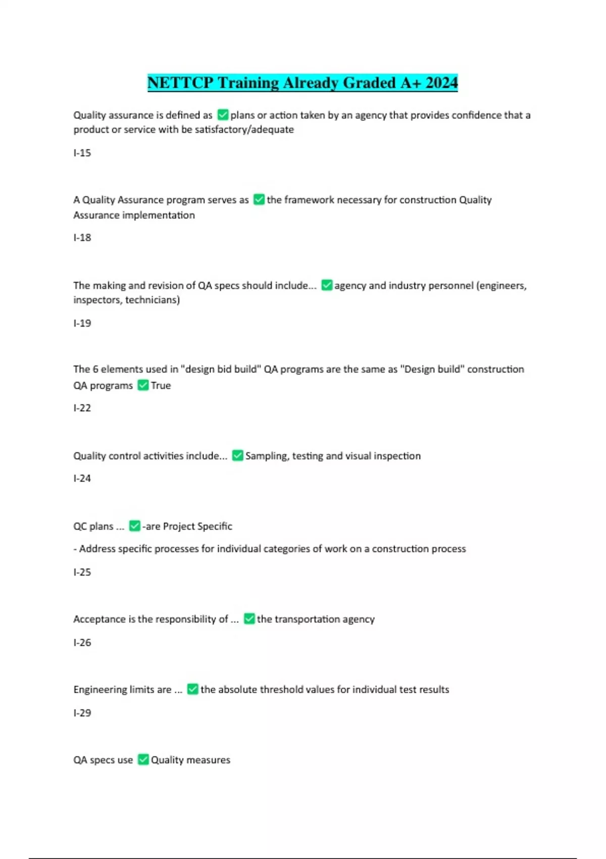NETTCP Training Already Graded A+ 2024 Quality assurance is defined as plans or action taken by an agency that provides confidence that a product or service with be satisfactory/adequate I-15 A Quality Assurance program serves as Assurance implementation I-18 the framework necessary for construction Quality The making and revision of QA specs should include... inspectors, technicians) I-19 True agency and industry personnel (engineers, The 6 elements used in "design bid build" QA programs are the same as "Design build" construction QA programs I-22 Quality control activities include... I-24 QC plans ... -are Project Specific Sampling, testing and visual inspection - Address specific processes for individual categories of work on a construction process I-25 Acceptance is the responsibility of ... I-26 Engineering limits are ... the transportation agency the absolute threshold values for individual test results I-29 QA specs use Quality measures I-28 The purpose of IA is to... I-34 identify discrepancies or differences in testing procedures or equipment IA comparison is performed on ... I-34 split samples If contractor QC test results are not used in acceptance... needed I-35 All agency central labs are ... a dispute resolution system is not required to be accredited through AASHTO accreditation program AAP Qualification/certification personnel should be... I-40 Each agency construction QA program must meet FHWA I-41 The D-3665 Random number table contains... II-4 The purpose of random numbers is to... required to re-cert every 2-5 yrs 23 CFR 637B and is required to be approved by 10000 numbers from 0.0000 to 1 help the sampler obtain unbiased samples I-1 A lot is... an isolated quantity of materials from one source that is assumed to be produced and placed by the same process II-2 ensure that samples obtained from a lot is not concentrated in one Sublot are established to location II-2 To determine the row of the random number selected by a calculator... 500 and round to the nearest whole number II-4 multiply the number by Statistical Samples are made up of samples, which are made up of increments II-3 true D 3665 states that the stratified random sampling procedure is the best and most practical method to ensure samples include the full range of construction process true II-1 to find the column of the number randomly generated by a calculator... multiply the number by 100 and round to the nearest whole number False- Multiply by 20 which is the number of columns on the table II-4 Random numbers drawn are final and cant be changed II-17 false The sampling methods described can only be used for QC sampling situations II-25 Sampling is equally as important as testing and should be done with precaution II-25 maximum size is False true the first sieve size that ALL material is required to pass through 11-26 Typically, AASHTO sampling procedure requires that all samples be composed of multiple increments true II-28 sampling devices used to interrupt flowing aggregate streams must be capable of interrupting ... of material that passes through it ALL II-28 Sampling with power equipment is preferred II-29 True Sampling stockpiles with power equipment is described as... sampling pile, back -dragging, and quadrant sampling II-29 remixing, re-entering, rolling out the When sampling from a stockpile with no power equipment the sampler should into quarters and obtain a sample from each quarter II-3- divide the pile When shoveling from a stockpile, only material from the ____________ layer should be taken