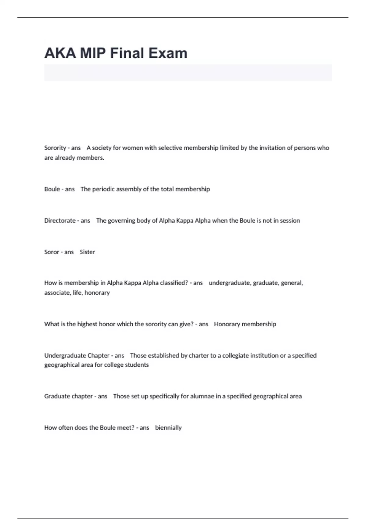 Sorority - ans A society for women with selective membership limited by the invitation of persons who are already members. Boule - ans The periodic assembly of the total membership Directorate - ans The governing body of Alpha Kappa Alpha when the Boule is not in session Soror - ans Sister How is membership in Alpha Kappa Alpha classified? - ans undergraduate, graduate, general, associate, life, honorary What is the highest honor which the sorority can give? - ans Honorary membership Undergraduate Chapter - ans Those established by charter to a collegiate institution or a specified geographical area for college students Graduate chapter - ans Those set up specifically for alumnae in a specified geographical area