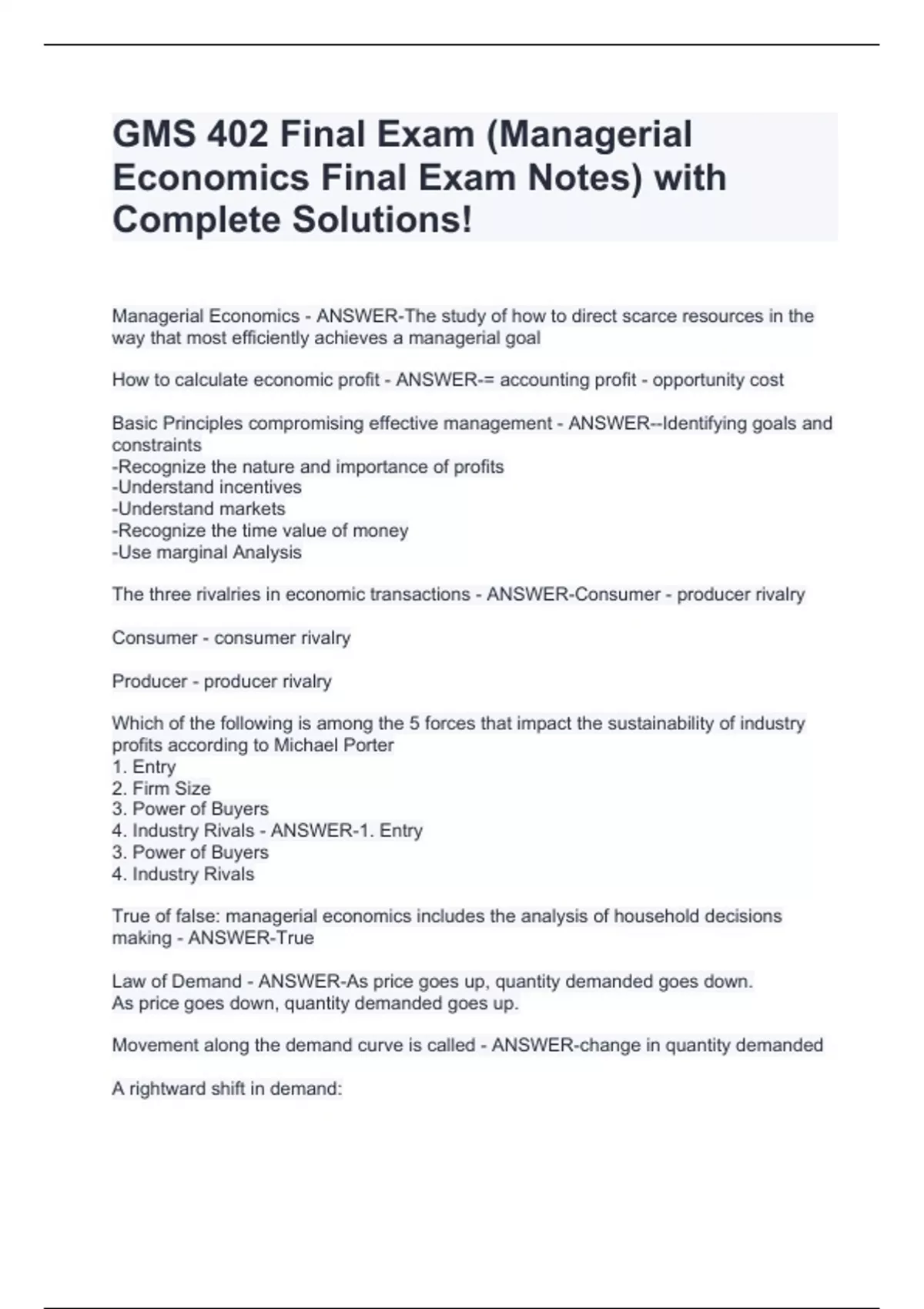 GMS 402 Final Exam (Managerial Economics Final Exam Notes) with Complete Solutions!
