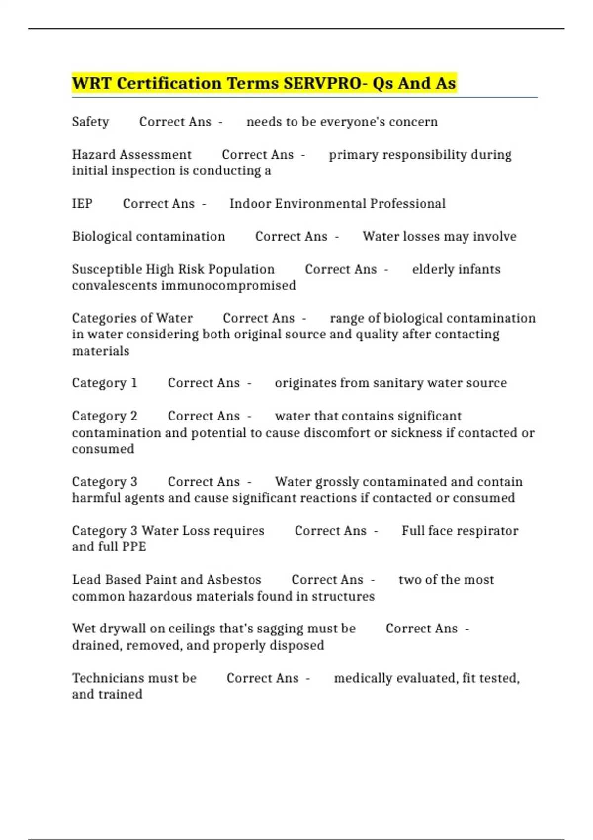 WRT Certification Terms SERVPRO- Qs And As