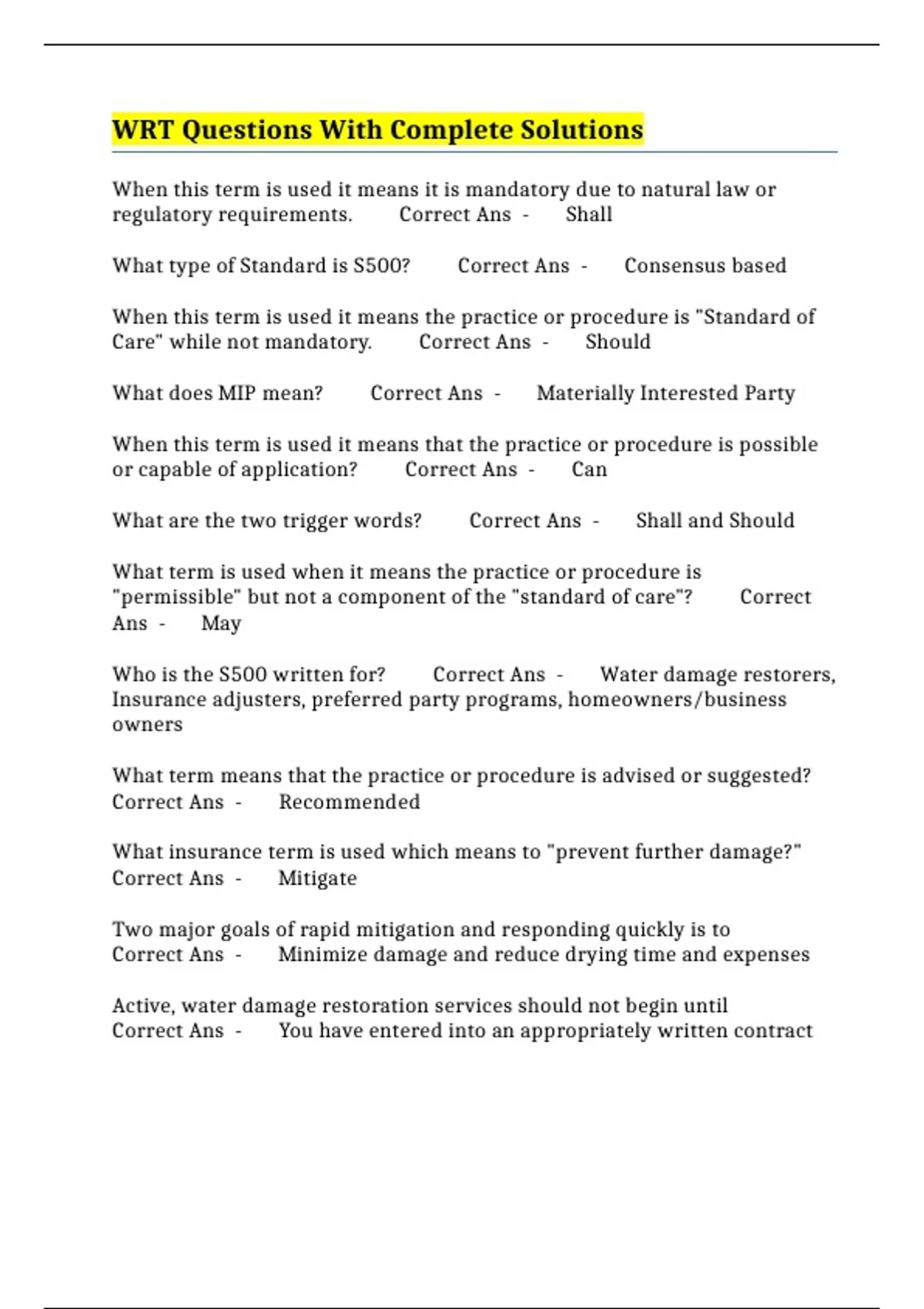 WRT Questions With Complete Solutions