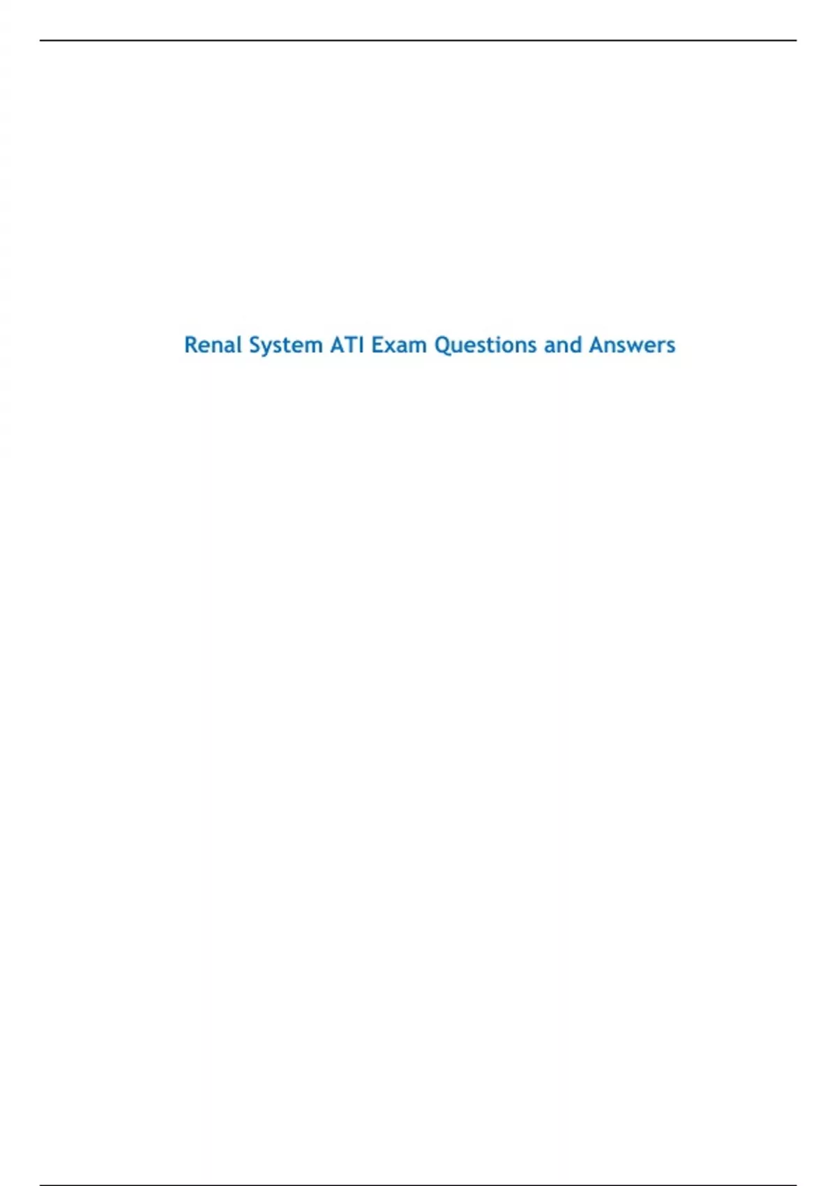 Renal System ATI Exam Questions and Answers Week 1 1. A nurse in a prenatal clinic is caring for a client who is at 7 weeks of gestation. The client reports urinary frequency and asks if this will continue until delivery. Which of the following responses should the nurse make? a. "It's a minor inconvenience, which you should ignore." i. This is a nontherapeutic response that disregards the client’s concern and offers unwarranted reassurance. b. "In most cases it only lasts until the 12th week, but it will continue if you have poor bladder tone." i. The presence or absence of bladder tone has no bearing on urinary frequency during pregnancy. c. "There is no way to predict how long it will last in each individual client." i. This is a nontherapeutic response that does not provide appropriate information to the client. d. "It occurs during the first trimester and near the end of the pregnancy." i. Urinary frequency is due to increased bladder sensitivity during the first trimester and recurs near the end of the pregnancy as the enlarging uterus places pressure on the bladder.
