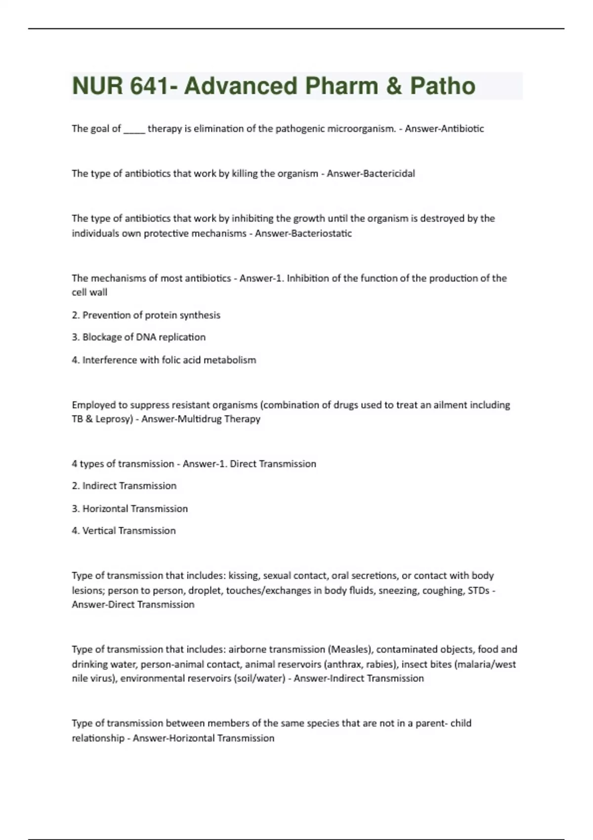 The goal of ____ therapy is elimination of the pathogenic microorganism. - Answer-Antibiotic The type of antibiotics that work by killing the organism - Answer-Bactericidal The type of antibiotics that work by inhibiting the growth until the organism is destroyed by the individuals own protective mechanisms - Answer-Bacteriostatic The mechanisms of most antibiotics - Answer-1. Inhibition of the function of the production of the cell wall 2. Prevention of protein synthesis 3. Blockage of DNA replication 4. Interference with folic acid metabolism Employed to suppress resistant organisms (combination of drugs used to treat an ailment including TB & Leprosy) - Answer-Multidrug Therapy 4 types of transmission - Answer-1. Direct Transmission 2. Indirect Transmission 3. Horizontal Transmission 4. Vertical Transmission Type of transmission that includes: kissing, sexual contact, oral secretions, or contact with body lesions; person to person, droplet, touches/exchanges in body fluids, sneezing, coughing, STDs - Answer-Direct Transmission Type of transmission that includes: airborne transmission (Measles), contaminated objects, food and drinking water, person-animal contact, animal reservoirs (anthrax, rabies), insect bites (malaria/west nile virus), environmental reservoirs (soil/water) - Answer-Indirect Transmission Type of transmission between members of the same species that are not in a parent- child relationship - Answer-Horizontal TransmissionType of transmission from parent to offspring, via placenta, breast milk, direct contact after birth, HIV - Answer-Vertical Transmission 5 stages of infection - Answer-1. Incubation 2. Prodromal 3. Acute 4. Convalescent 5. Resolution 3 stages of the inflammatory response - Answer-1. Inflammatory response 2. Repair and Regeneration 3. Remodeling and Maturation Stage of the inflammatory response in which healing of acute injuries begins - Answer-Inflammatory Stage of inflammatory response in which there is new collagen formation - Answer-Repair and Regeneration Aspirin, Celecoxib, Diclofenac, Etodolac, Fenoprofen, Ibuprofen, Ketorolac, Meloxicam, Nabumetone, Naproxen, Oxaproxin, Salsalate, and Acetaminophen are all examples of what drug class? - AnswerNSAIDS Medication class that works by inhibiting prostaglandin synthesis - Answer-NSAIDS Adverse effects of NSAIDS - Answer-GI bleed, dyspepsia, increased risk of bleeding, can displace other highly bound proteins including warfarin, headache, dizziness, confusion, tinnitus Two types of corticosteroids - Answer-Glucocorticoids and Mineralocorticoids Type of corticosteroids that promote normal intermediary metabolism, increase resistance to stress, alter blood levels in plasma, and have anti-inflammatory actions - Answer-GlucocorticoidsType of corticosteroids that control fluid status and concentration of electrolytes (sodium and potassium) - Answer-Mineralcorticoids Where are cortocosteriods metabolized? - Answer-Liver Adverse effects of corticosteroids - Answer-Suppress calcium absorption, redistribute body fat (puffy face, hirsutism, and increase appetite), cataracts, hyperglycemia, hypertension, hypokalemia, peripheral edema, and increase risk of infection The time it takes for the concentration of the drug in the plasma or the total amount to be reduced by 50% - Answer-Half life What the body does to the drug - Answer-Pharmacokinetics
