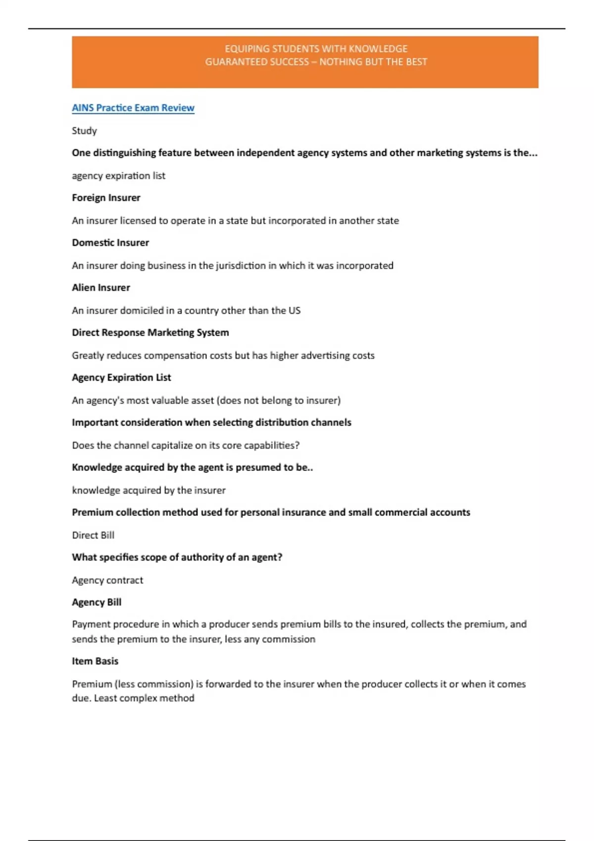 One distinguishing feature between independent agency systems and other marketing systems is the... agency expiration list Foreign Insurer An insurer licensed to operate in a state but incorporated in another state Domestic Insurer An insurer doing business in the jurisdiction in which it was incorporated Alien Insurer An insurer domiciled in a country other than the US Direct Response Marketing System Greatly reduces compensation costs but has higher advertising costs Agency Expiration List An agency's most valuable asset (does not belong to insurer) Important consideration when selecting distribution channels Does the channel capitalize on its core capabilities? Knowledge acquired by the agent is presumed to be.. knowledge acquired by the insurer Premium collection method used for personal insurance and small commercial accounts Direct Bill What specifies scope of authority of an agent? Agency contract Agency Bill Payment procedure in which a producer sends premium bills to the insured, collects the premium, and sends the premium to the insurer, less any commission Item Basis Premium (less commission) is forwarded to the insurer when the producer collects it or when it comes due. Least complex method