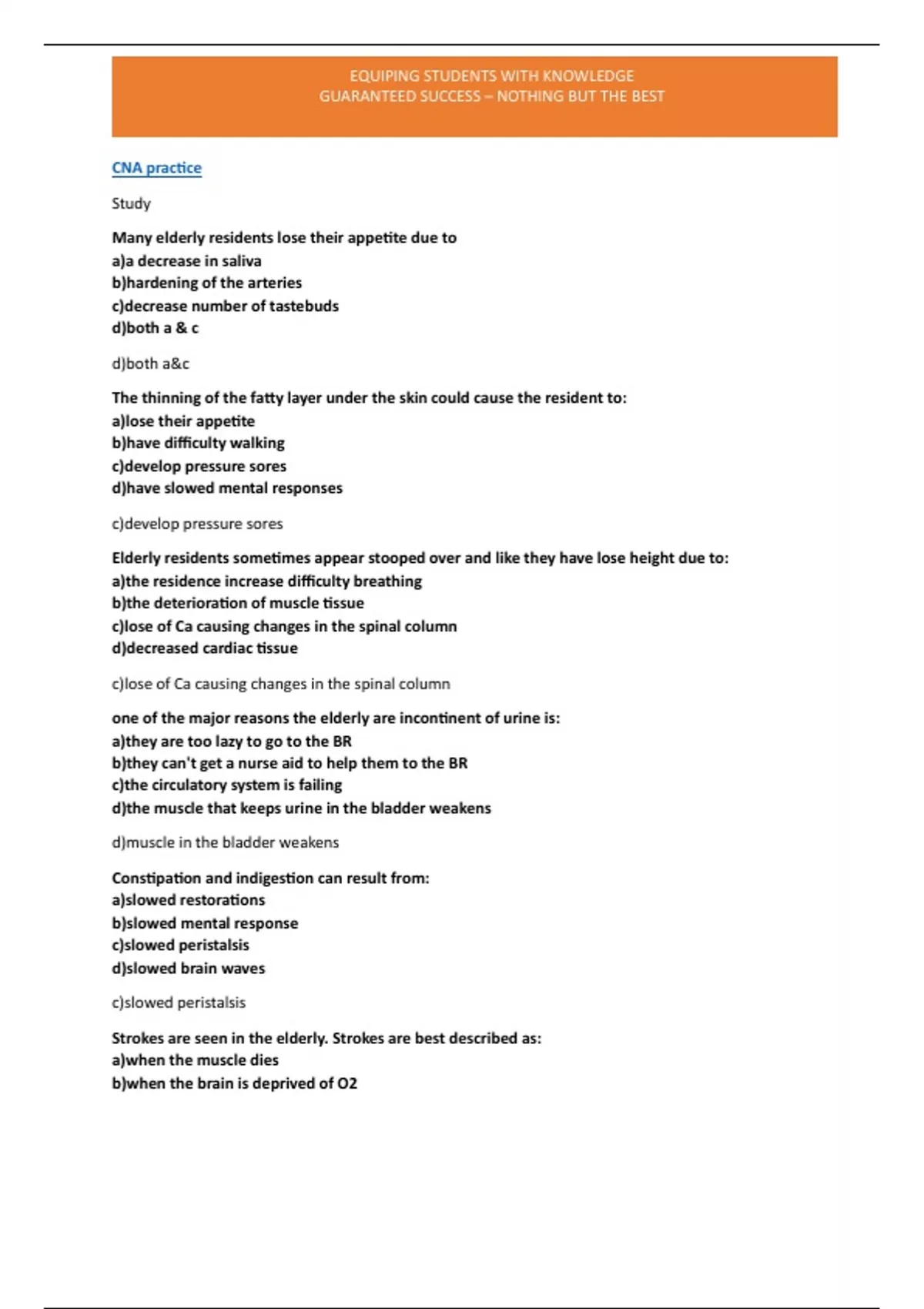 Many elderly residents lose their appetite due to a)a decrease in saliva b)hardening of the arteries c)decrease number of tastebuds d)both a & c d)both a&c The thinning of the fatty layer under the skin could cause the resident to: a)lose their appetite b)have difficulty walking c)develop pressure sores d)have slowed mental responses c)develop pressure sores Elderly residents sometimes appear stooped over and like they have lose height due to: a)the residence increase difficulty breathing b)the deterioration of muscle tissue c)lose of Ca causing changes in the spinal column d)decreased cardiac tissue c)lose of Ca causing changes in the spinal column one of the major reasons the elderly are incontinent of urine is: a)they are too lazy to go to the BR b)they can't get a nurse aid to help them to the BR c)the circulatory system is failing d)the muscle that keeps urine in the bladder weakens d)muscle in the bladder weakens Constipation and indigestion can result from: a)slowed restorations b)slowed mental response c)slowed peristalsis d)slowed brain waves c)slowed peristalsis