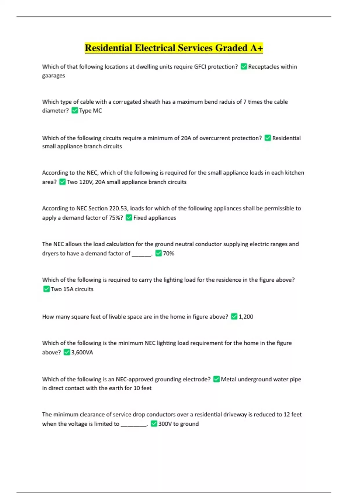 Residential Electrical Services Graded A+ Which of that following locations at dwelling units require GFCI protection? gaarages Type MC Receptacles within Which type of cable with a corrugated sheath has a maximum bend raduis of 7 times the cable diameter? Which of the following circuits require a minimum of 20A of overcurrent protection? small appliance branch circuits Residential According to the NEC, which of the following is required for the small appliance loads in each kitchen area? Two 120V, 20A small appliance branch circuits According to NEC Section 220.53, loads for which of the following appliances shall be permissible to apply a demand factor of 75%? Fixed appliances The NEC allows the load calculation for the ground neutral conductor supplying electric ranges and dryers to have a demand factor of ______. 70% Which of the following is required to carry the lighting load for the residence in the figure above? Two 15A circuits How many square feet of livable space are in the home in figure above? 3,600VA 1,200 Which of the following is the minimum NEC lighting load requirement for the home in the figure above? Which of the following is an NEC-approved grounding electrode? in direct contact with the earth for 10 feet Metal underground water pipe The minimum clearance of service drop conductors over a residential driveway is reduced to 12 feet when the voltage is limited to ________. 300V to ground The section of the NEC that lists the requirements for installing service disconnecting means is ______. NEC Section 230.70 Romex is a trade name for _____. Type NM cable Cables routed through bored holes in framing members must maintain a distance from the nearest edge of not less than ______. 1-1/4 inches Which of the following must be supported at intervals of 6 feet or less? Type MC cable Which of the following will detect a current imbalance as low as 4 miliamps? Type SE cable A GFCI sensor When used as an outside service-entrance conductor, which of the following must be secured every 30 inches? Traveler conductors are used to connect two _______. Three-way switches To control a device from three locations, a four-way switch must be used with which of the following? Two three- way switches To control stairway lighting, a wall switch is required at each level when how many risers separate f loor levels? Six or more Which section of the NEC covers the installation of pools and spas? A GFCI sensor will trip when the ____. NEC Section 680 current in the neutral load is less than the current in the hot load. Listed FMC may be used as an equipment grounding conductor if the circuit conductors are