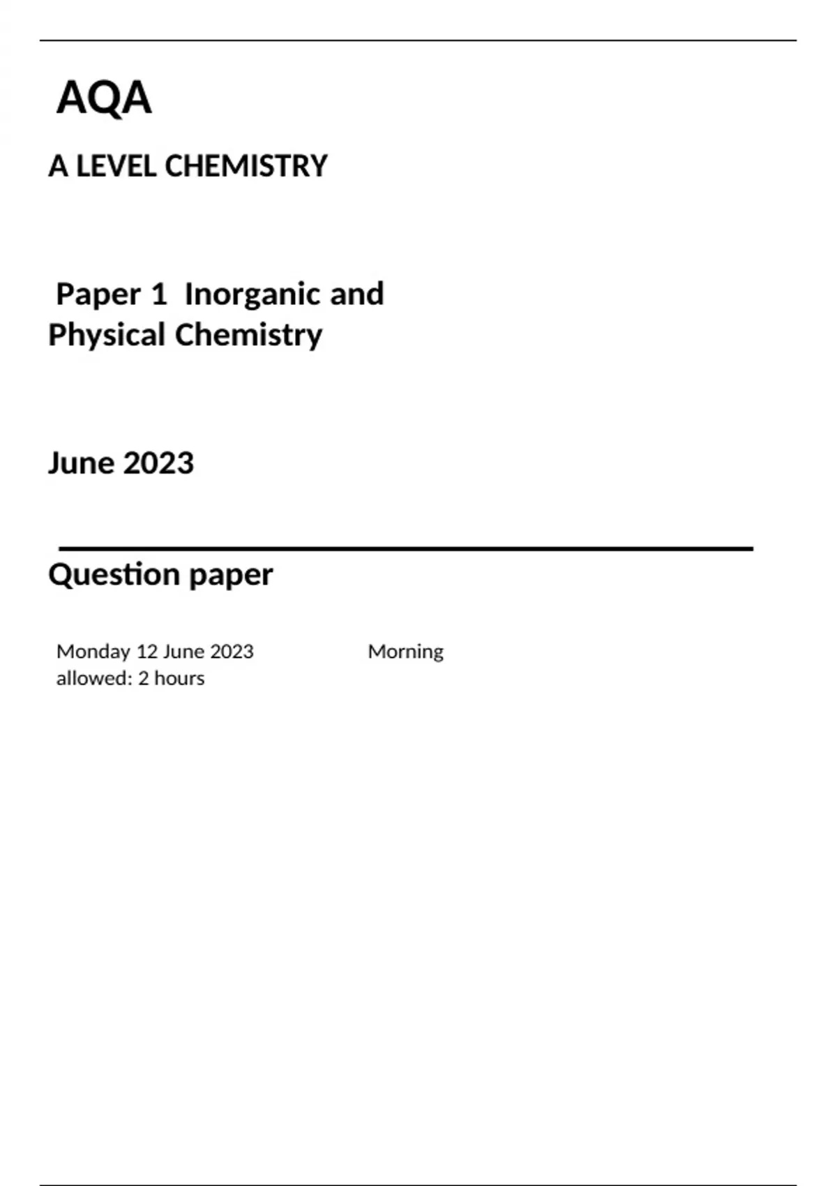 AQA A level chemistry paper 1 QUESTION PAPER for June 2023