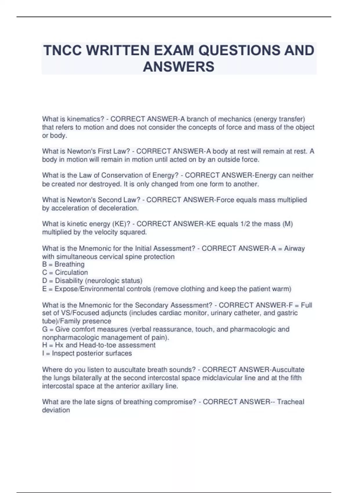 TNCC WRITTEN EXAM QUESTIONS AND ANSWERS What is kinematics? - CORRECT ANSWER-A branch of mechanics (energy transfer) that refers to motion and does not consider the concepts of force and mass of the object or body. What is Newton's First Law? - CORRECT ANSWER-A body at rest will remain at rest. A body in motion will remain in motion until acted on by an outside force. What is the Law of Conservation of Energy? - CORRECT ANSWER-Energy can neither be created nor destroyed. It is only changed from one form to another. What is Newton's Second Law? - CORRECT ANSWER-Force equals mass multiplied by acceleration of deceleration. What is kinetic energy (KE)? - CORRECT ANSWER-KE equals 1/2 the mass (M) multiplied by the velocity squared. What is the Mnemonic for the Initial Assessment? - CORRECT ANSWER-A = Airway with simultaneous cervical spine protection B = Breathing C = Circulation D = Disability (neurologic status) E = Expose/Environmental controls (remove clothing and keep the patient warm) What is the Mnemonic for the Secondary Assessment? - CORRECT ANSWER-F = Full set of VS/Focused adjuncts (includes cardiac monitor, urinary catheter, and gastric tube)/Family presence G = Give comfort measures (verbal reassurance, touch, and pharmacologic and nonpharmacologic management of pain). H = Hx and Head-to-toe assessment I = Inspect posterior surfaces Where do you listen to auscultate breath sounds? - CORRECT ANSWER-Auscultate the lungs bilaterally at the second intercostal space midclavicular line and at the fifth intercostal space at the anterior axillary line. What are the late signs of breathing compromise? - CORRECT ANSWER-- Tracheal deviation - JVD What are signs of ineffective breathing? - CORRECT ANSWER-- AMS - Cyanosis, especially around the mouth - Asymmetric expansion of chest wall - Paradoxical movement of the chest wall during inspiration and expiration - Use of accessory muscles or abdominal muscles or both or diaphragmatic breathing - Sucking chest wounds - Absent or diminished breath sounds - Administer O2 via NRB or assist ventilations with a bag-mask device, as indicated - Anticipate definitive airway management to support ventilation. Upon initial assessment, what type of oxygen should be used for a pt breathing effectively? - CORRECT ANSWER-A tight-fitting nonrebreather mask at 12-15 lpm. What intervention should be done if a pt presents with effective circulation? - CORRECT ANSWER-- Insert 2 large caliber IV's - Administer warmed isotonic crystalloid solution at an appropriate rate What are signs of ineffective circulation? - CORRECT ANSWER-- Tachycardia - AMS - Uncontrolled external bleeding - Pale, cool, moist skin - Distended or abnormally flattened external jugular veins - Distant heart sounds What are the interventions for Effective/Ineffective Circulation? - CORRECT ANSWER-- Control any uncontrolled external bleeding by: - Applying direct pressure over bleeding site - Elevating bleeding extremity - Applying pressure over arterial pressure points - Using tourniquet (last resort). - Cannulate 2 large-caliber IV's and initiate infusions of an isotonic crystalloid solution - Use warmed solution - Use pressure bags to increase speed of IVF infusion - Use blood administration tubing for possible administration of blood - Use rapid infusion device based on protocol - Use NS 0.9% in same tubing as blood product - IV = surgical cut-down, central line, or both. - Blood sample to determine ABO and Rh group - IO in sternum, legs, arms or pelvis - Administer blood products - PASG (without interfering with fluid resuscitation) How do you assess Mnemonic "D"? - CORRECT ANSWER-DISABILITY A = Alert V = Verbal P = Pain U = Unresponsive - GCS - PERRL? - Determine presence of lateralizing signs including: - Unilateral deterioration in motor movements or unequal pupils - Symptoms that help to locate area of injury in brain What are the interventions for Disability? - CORRECT ANSWER-- If assessment indicates a decreased LOC, conduct further investigation during secondary focused assessments - If pt is not alert or verbal, continue to monitor for any compromise to ABC's - If pt demonstrates signs of herniation or neurologic deterioration, consider hyperventilation. What is assessed and intervened for Expose/Environmental Controls? - CORRECT ANSWER-- Remove clothing - Ensure appropriate decontamination if exposed to hazardous material - Keep pt warm - Keep clothing for evidence What is the first thing assessed under the Secondary Assessment? - CORRECT ANSWER-FULL SET VS / FOCUSED ADJUNCTS / FAMILY PRESENCE - ABCDE should be completed - Labs, X-rays, CT, Foley, - Family Presence What is the second thing assessed under the Secondary Assessment? - CORRECT ANSWER-GIVE COMFORT MEASURES - Talking to pt - Pharmacologic/Nonpharmacologic pain management - Observe for physical signs of pain What is assessed under the Mnemonic "H"? - CORRECT ANSWER-HISTORY / HEADTO-TOE ASSESSMENT - MIVT - M = Mechanism of injury - I = Injuries sustained - V = Vital Signs - T = Treatment - Pt generated information - PMH - Head-to-toe assessment