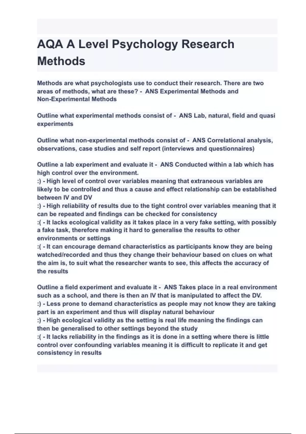 AQA A Level Psychology Research Methods Exam Questions with correct Answers 2024/2025( A+ GRADED 100% VERIFIED).