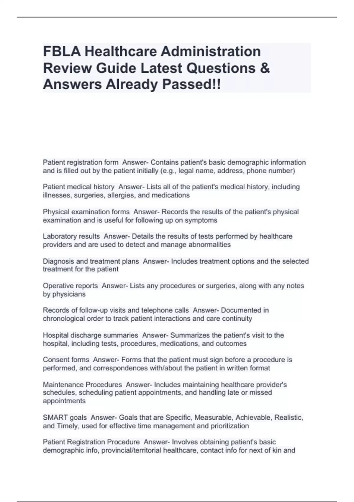 FBLA Healthcare Administration Review Guide Latest Questions & Answers Already Passed!!
