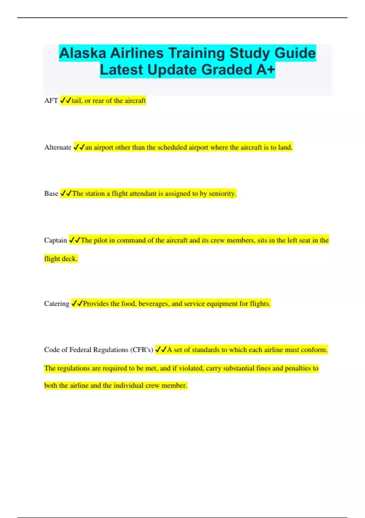 Alaska Airlines Training Study Guide Latest Update Graded A+ AFT tail, or rear of the aircraft Alternate an airport other than the scheduled airport where the aircraft is to land. Base The station a flight attendant is assigned to by seniority. Captain The pilot in command of the aircraft and its crew members, sits in the left seat in the flight deck. Catering Provides the food, beverages, and service equipment for flights. Code of Federal Regulations (CFR's) A set of standards to which each airline must conform. The regulations are required to be met, and if violated, carry substantial fines and penalties to both the airline and the individual crew member. crew scheduling Responsible for ensuring all flights are staffed with the correct number of flight attendants and flight deck crew members. Customer Service Agents (CSA's) Sell tickets, check in customers, board flights and assist customers with other requests while on the ground. deadheading this is a term used for crew members traveling on a flight as a non-working crew member to position them for a flight that originates in another city. de-icing fluid sprayed on the exterior of the aircraft in cold conditions to remove frost, snow, and ice from the exterior surfaces of the aircraft and prevent their reformation. Deplane the procedure in which customers leave the aircraft. ETA Estimated time of Arrival ETD Estimated time of Departure Federal Aviation Administration (FAA) This government agency serves the public in the fields of aviation safety, airways, airports, development and information. First Officer (FO) The pilot who is second in command on a flight. Sits in the right seat in the flight deck. Fleet Service This group is responsible for the supplies and condition of the airplane cabin. Flight Deck The pilot's compartment containing all the controls and navigation equipment for flying the aircraft.