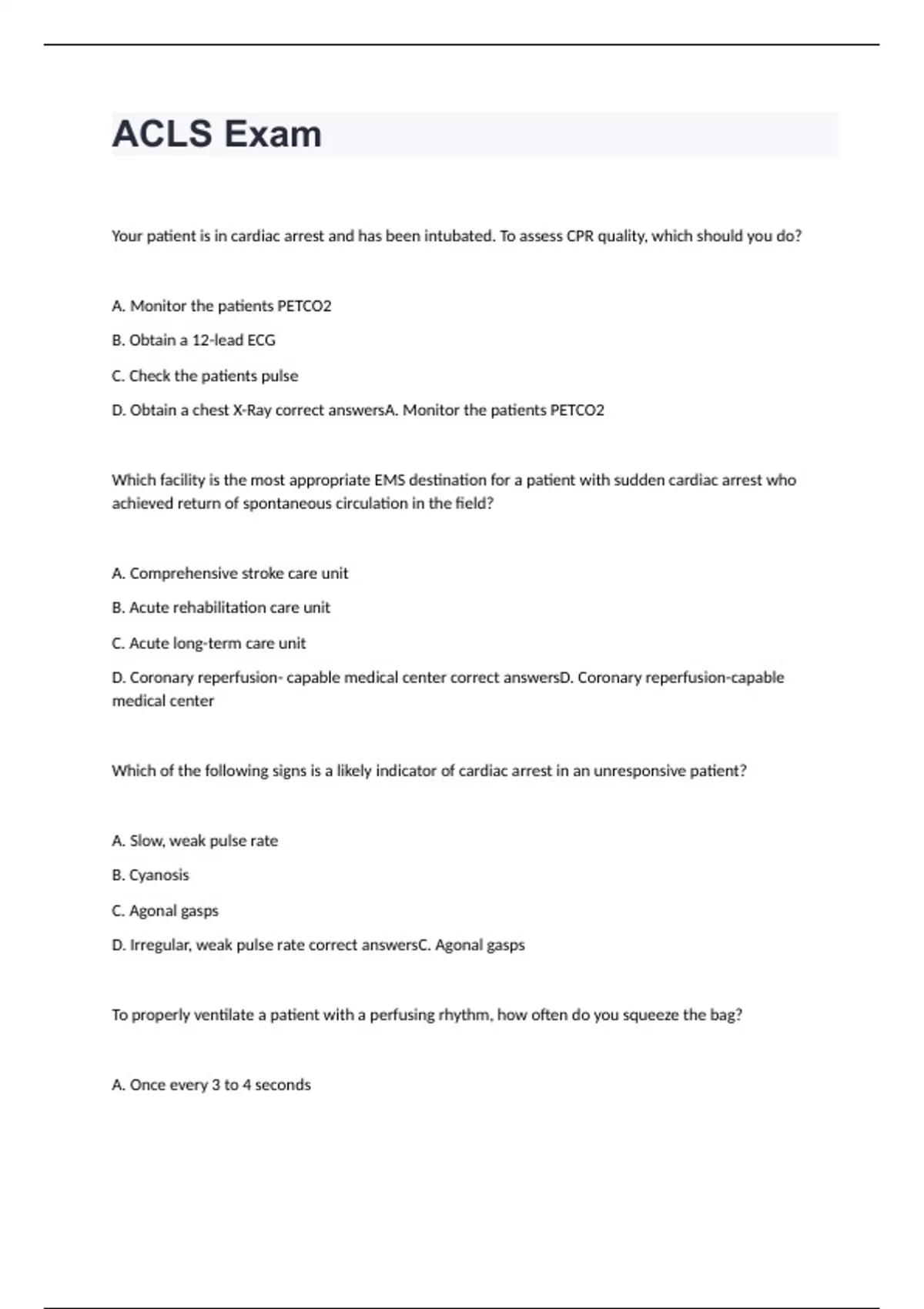 Your patient is in cardiac arrest and has been intubated. To assess CPR quality, which should you do? A. Monitor the patients PETCO2 B. Obtain a 12-lead ECG C. Check the patients pulse D. Obtain a chest X-Ray correct answersA. Monitor the patients PETCO2 Which facility is the most appropriate EMS destination for a patient with sudden cardiac arrest who achieved return of spontaneous circulation in the field? A. Comprehensive stroke care unit B. Acute rehabilitation care unit C. Acute long-term care unit D. Coronary reperfusion- capable medical center correct answersD. Coronary reperfusion-capable medical center Which of the following signs is a likely indicator of cardiac arrest in an unresponsive patient? A. Slow, weak pulse rate B. Cyanosis C. Agonal gasps D. Irregular, weak pulse rate correct answersC. Agonal gasps To properly ventilate a patient with a perfusing rhythm, how often do you squeeze the bag? A. Once every 3 to 4 seconds