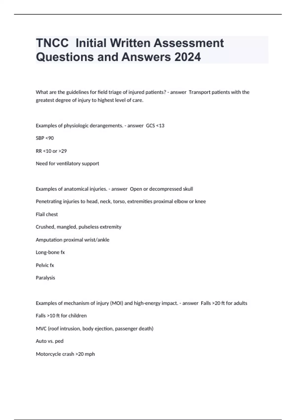 TNCC Initial Written Assessment Questions and Answers 2024 What are the guidelines for field triage of injured patients? Transport patients with the greatest degree of injury to highest level of care. Examples of physiologic derangements. GCS <13 SBP <90 RR <10 or >29 Need for ventilatory support Examples of anatomical injuries. Open or decompressed skull Penetrating injuries to head, neck, torso, extremities proximal elbow or knee Flail chest Crushed, mangled, pulseless extremity Amputation proximal wrist/ankle Long-bone fx Pelvic fx Paralysis Examples of mechanism of injury (MOI) and high-energy impact. Falls >20 ft for adults Falls >10 ft for children MVC (roof intrusion, body ejection, passenger death) Auto vs. ped Motorcycle crash >20 mph