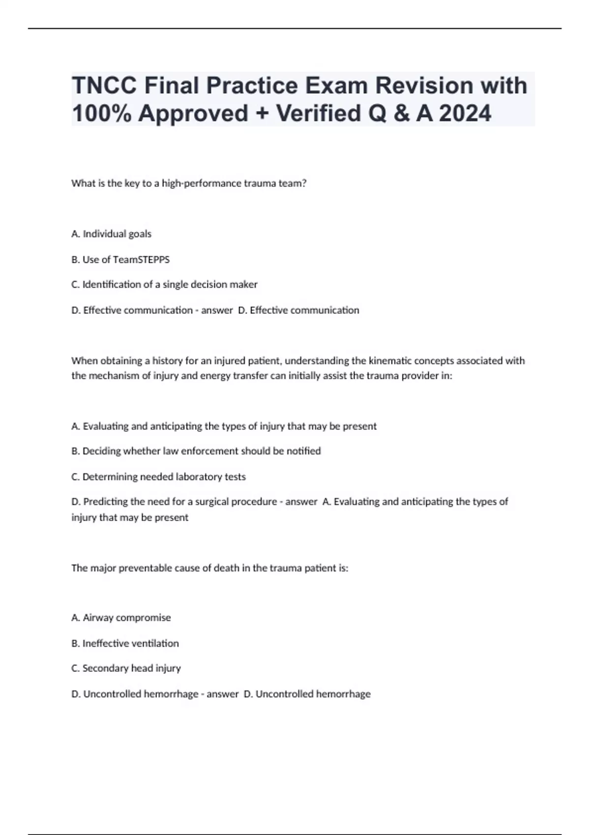 TNCC Final Practice Exam Revision with 100% Approved + Verified Q & A 2024 What is the key to a high-performance trauma team? A. Individual goals B. Use of TeamSTEPPS C. Identification of a single decision maker D. Effective communication D. Effective communication When obtaining a history for an injured patient, understanding the kinematic concepts associated with the mechanism of injury and energy transfer can initially assist the trauma provider in: A. Evaluating and anticipating the types of injury that may be present B. Deciding whether law enforcement should be notified C. Determining needed laboratory tests D. Predicting the need for a surgical procedure A. Evaluating and anticipating the types of injury that may be present The major preventable cause of death in the trauma patient is: A. Airway compromise B. Ineffective ventilation C. Secondary head injury D. Uncontrolled hemorrhage D. Uncontrolled hemorrhage The across-the-room observation step in the initial assessment providers the opportunity to: A. Assess for uncontrolled internal hemorrhage B. Accurately triage the patient C. Reprioritize circulation before airway or breathing D. Activate the trauma team C. Reprioritize circulation before airway or breathing