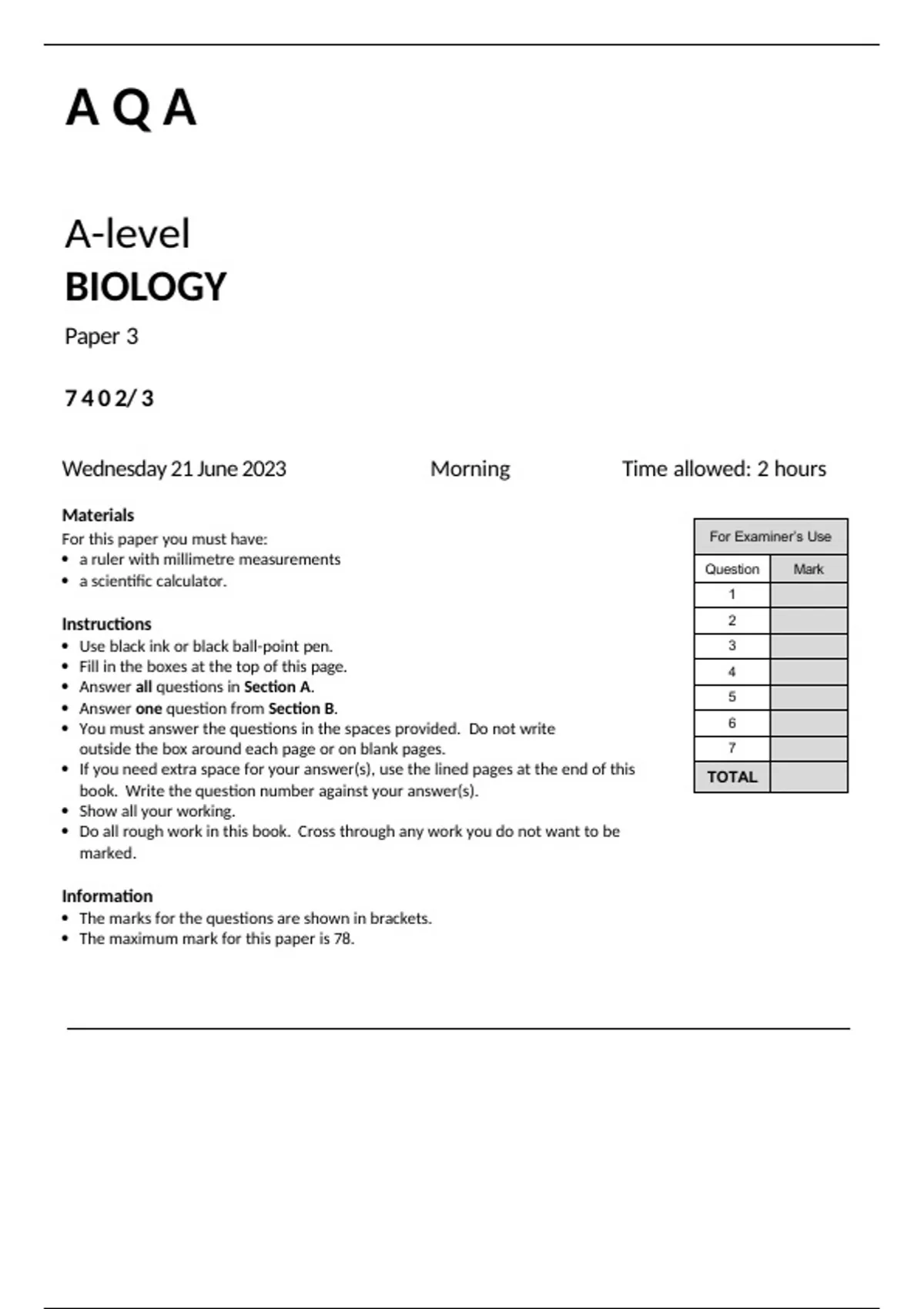AQA A Level Biology paper 3 QUESTION PAPER for June 2023- 7 4 0 2/ 3