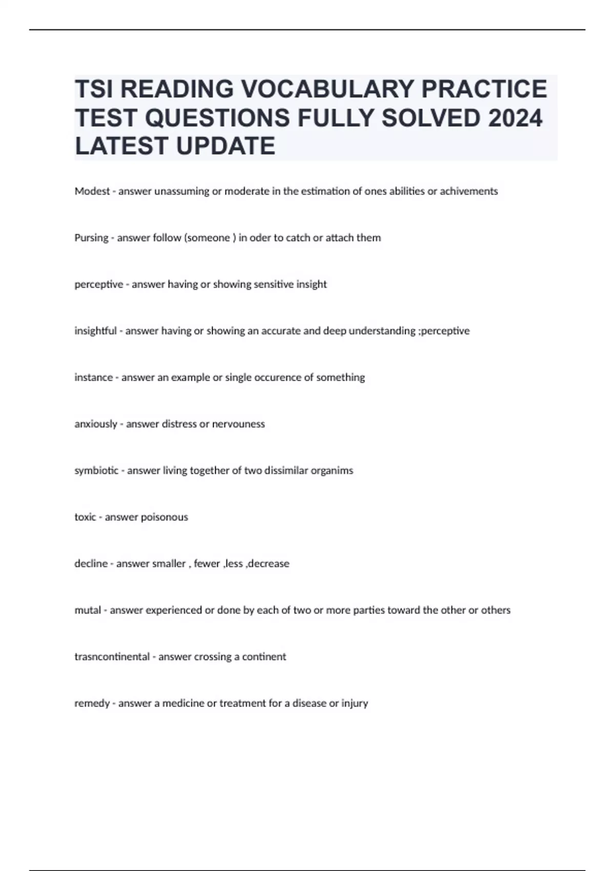 TSI READING VOCABULARY PRACTICE TEST QUESTIONS FULLY SOLVED 2024