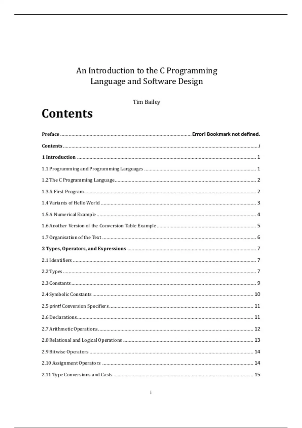 Introduction This textbook was written with two primary objectives. The first is to introduce the C programming language. C is a practical and still-current software tool; it remains one of the most popular programming languages in existence, particularly in areas such as embedded systems. C facilitates writing code that is very efficient and powerful and, given the ubiquity of C compilers, can be easily ported to many different platforms. Also, there is an enormous code-base of C programs developed over the last 30 years, and many systems that will need to be maintained and extended for many years to come. The second key objective is to introduce the basic concepts of software design. At one-level this is C-specific: to learn to design, code and debug complete C programs. At another level, it is more general: to learn the necessary skills to design large and complex software systems. This involves learning to decompose large problems into manageable systems of modules; to use modularity and clean interfaces to design for correctness, clarity and flexibility. 1.1 Programming and Programming Languages The native language of a computer is binary—ones and zeros—and all instructions and data must be provided to it in this form. Native binary code is called machine language. The earliest digital electronic computers were programmed directly in binary, typically via punched cards, plug-boards, or front-panel switches. Later, with the advent of terminals with keyboards and monitors, such programs were written as sequences of hexadecimal numbers, where each hexadecimal digit represents a four binary digit sequence. Developing correct programs in machine language is tedious and complex, and practical only for very small programs. In order to express operations more abstractly, assembly languages were developed. These languages have simple mnemonic instructions that directly map to a sequence of machine language operations. For example, the MOV instruction moves data into a register, the ADD instruction adds the contents of two registers together. Programs written in assembly language are translated to machine code using an assembler program. While assembly languages are a considerable improvement on raw binary, they still very low-level and unsuited to large-scale programming. Furthermore, since each processor provides its own assembler dialect, assembly language programs tend to be non-portable; a program must be rewritten to run on a different machine. The 1950s and 60s saw the introduction of high-level languages, such as Fortran and Algol. These languages provide mechanisms, such as subroutines and conditional looping constructs, which greatly enhance the structure of a program, making it easier to express the progression of instruction execution; that is, easier to visualise program flow. Also, these mechanisms are an abstraction of the underlying machine instructions and, unlike assembler, are not tied to any particular hardware. Thus, ideally, a program written in a high-level language may be ported to a different machine and run without change. To produce executable code from such a program, it is translated to machinespecific assembler language by a compiler program, which is then coverted to machine code by an assembler (see Appendix B for details on the compilation process). Compiled code is not the only way to execute a high-level program. An alternative is to translate the program on-the-fly using an interpreter program (e.g., Matlab, Python, etc). Given a text-file containing a high-level program, the interpreter reads a high-level instruction and then executes the necessary set of low-level operations. While usually slower than a compiled program, interpreted code avoids the overhead of compilation-time and so is good for rapid implementation and testing. Another alternative, intermediate between compiled and interpreted code, is provided by a virtual machine (e.g., the Java virtual machine), which behaves as an abstract-machine layer on top of a real machine. A high-level program is compiled to a special byte-code rather than machine language, and this intermediate code is then interpreted by the virtual machine program. Interpreting byte code is usually much faster than interpreting high-level code directly. Each of these representations has is relative advantages: compiled code is typically fastest, interpreted code is highly portable and quick to implement and test, and a virtual machine offers a combination of speed and portability. The primary purpose of a high-level language is to permit more direct expression of a programmer’s design. The algorithmic structure of a program is more apparent, as is the flow of information between different program components. High-level code modules can be designed to “plug” together piece-by-piece, allowing large programs to be built out of small, comprehensible parts. It is important to realise that programming in a high-level language is about communicating a software design to programmers not to the computer. Thus, a programmer’s focus should be on modularity and readability rather than speed. Making the program run fast is (mostly) the compiler’s concern.