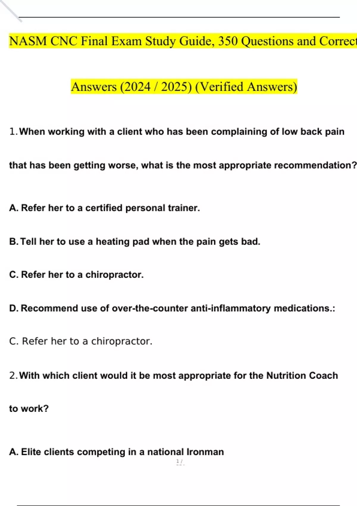 NASM CNC Final Exam Study Guide, 350 Questions and Answers (2024 / 2025) (Verified Answers)