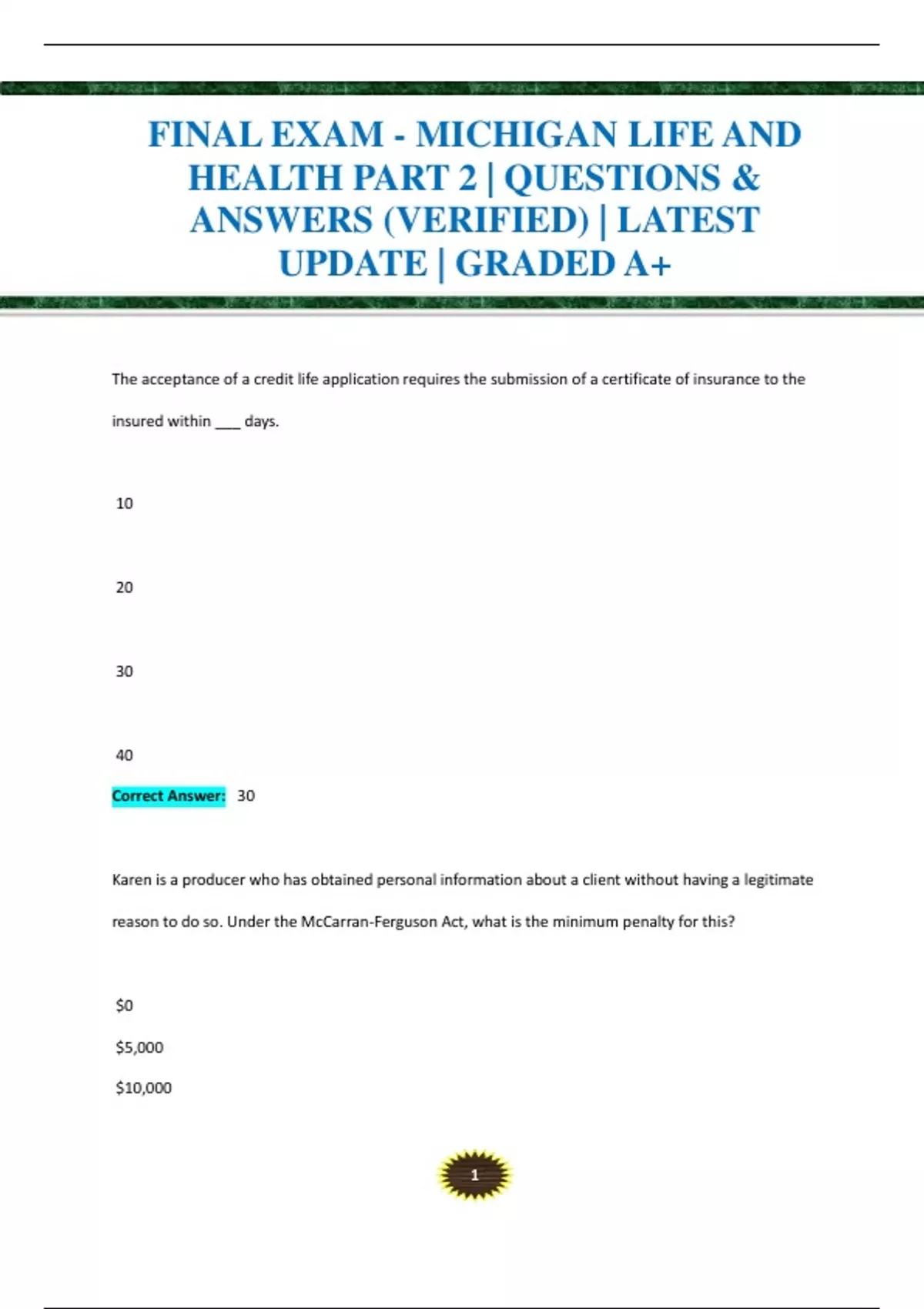 FINAL EXAM - MICHIGAN LIFE AND HEALTH PART 2 | QUESTIONS & ANSWERS (VERIFIED) | LATEST UPDATE | GRADED A+