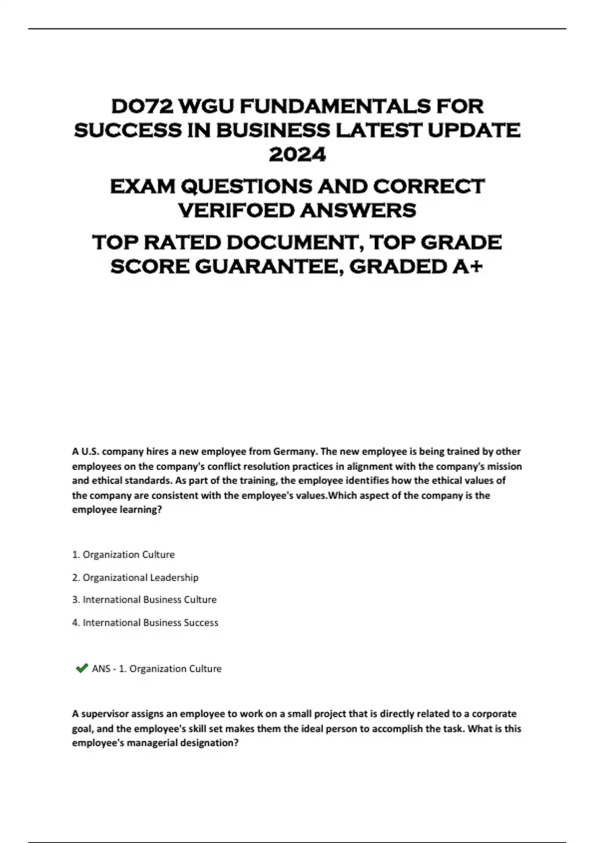 DO72 WGU FUNDAMENTALS FOR SUCCESS IN BUSINESS LATEST UPDATE 2024 EXAM QUESTIONS AND CORRECT VERIFOED ANSWERS TOP RATED DOCUMENT, TOP GRADE SCORE GUARANTEE, GRADED A+