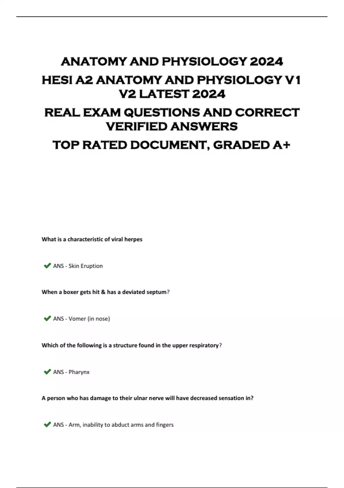 ANATOMY AND PHYSIOLOGY 2024 HESI A2 ANATOMY AND PHYSIOLOGY V1 V2 LATEST 2024 REAL EXAM QUESTIONS AND CORRECT VERIFIED ANSWERS TOP RATED DOCUMENT, GRADED A+