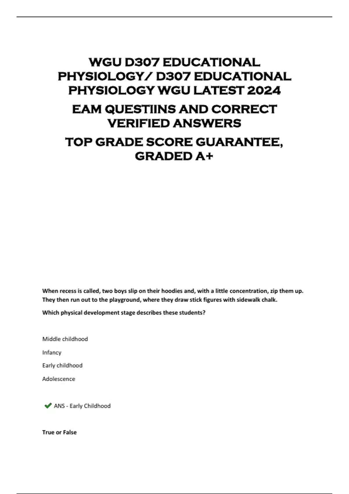 WGU D307 EDUCATIONAL PHYSIOLOGY/ D307 EDUCATIONAL PHYSIOLOGY WGU LATEST 2024 EAM QUESTIINS AND CORRECT VERIFIED ANSWERS TOP GRADE SCORE GUARANTEE, GRADED A+