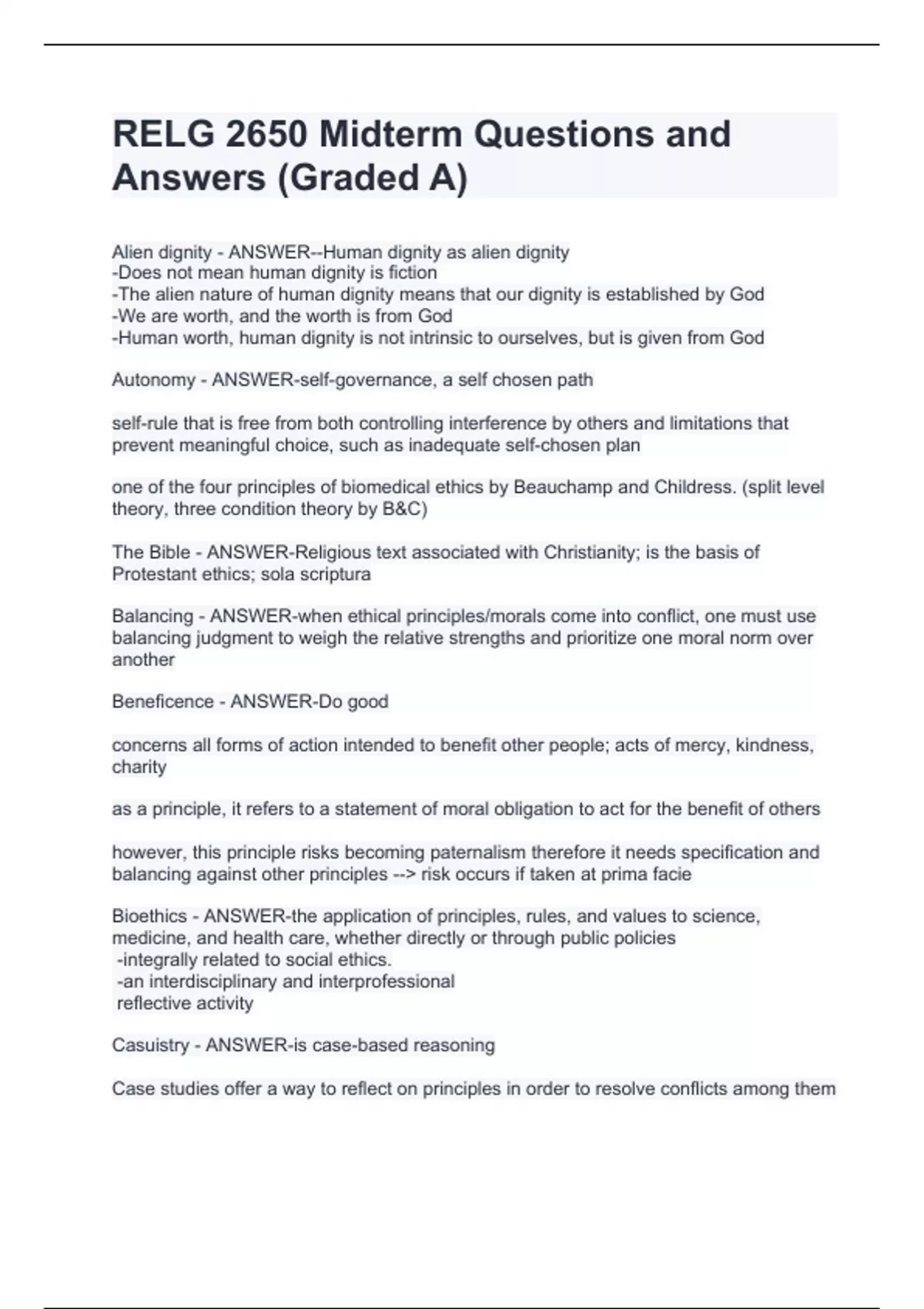RELG 2650 Midterm Questions and Answers (Graded A)RELG 2650 Midterm Questions and Answers (Graded A)RELG 2650 Midterm Questions and Answers (Graded A)RELG 2650 Midterm Questions and Answers (Graded A) Alien dignity - ANSWER--Human dignity as alien dignity -Does not mean human dignity is fiction -The alien nature of human dignity means that our dignity is established by God -We are worth, and the worth is from God -Human worth, human dignity is not intrinsic to ourselves, but is given from God Autonomy - ANSWER-self-governance, a self chosen path self-rule that is free from both controlling interference by others and limitations that prevent meaningful choice, such as inadequate self-chosen plan one of the four principles of biomedical ethics by Beauchamp and Childress. (split level theory, three condition theory by B&C) The Bible - ANSWER-Religious text associated with Christianity; is the basis of Protestant ethics; sola scriptura Balancing - ANSWER-when ethical principles/morals come into conflict, one must use