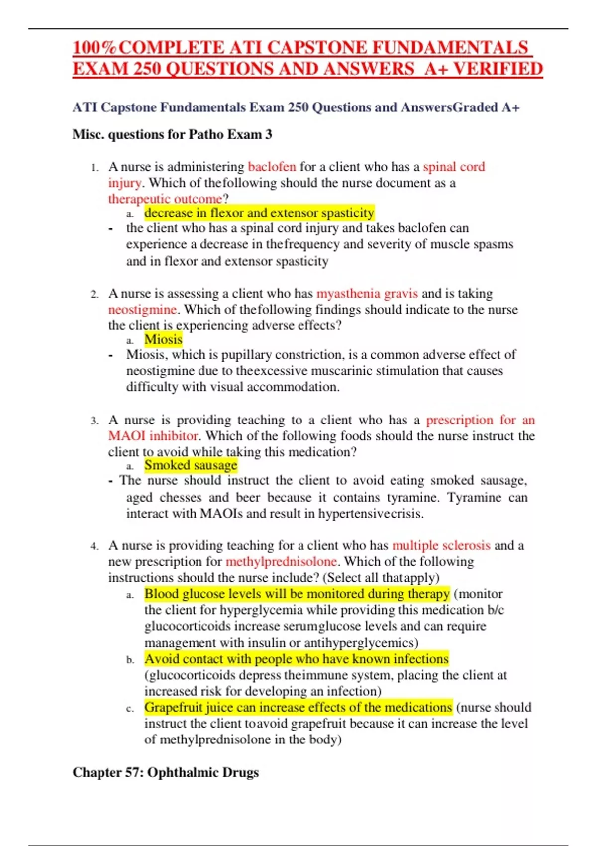 100%COMPLETE ATI CAPSTONE FUNDAMENTALS EXAM 250 QUESTIONS AND ANSWERS A+ VERIFIED ANSWERS ATI Capstone Fundamentals Exam 250 Questions and AnswersGraded A+ Misc. questions for Patho Exam 3 1. A nurse is administering baclofen for a client who has a spinal cord injury. Which of thefollowing should the nurse document as a therapeutic outcome? a. decrease in flexor and extensor spasticity - the client who has a spinal cord injury and takes baclofen can experience a decrease in thefrequency and severity of muscle spasms and in flexor and extensor spasticity 2. A nurse is assessing a client who has myasthenia gravis and is taking neostigmine. Which of thefollowing findings should indicate to the nurse the client is experiencing adverse effects? a. Miosis - Miosis, which is pupillary constriction, is a common adverse effect of neostigmine due to theexcessive muscarinic stimulation that causes difficulty with visual accommodation. 3. A nurse is providing teaching to a client who has a prescription for an MAOI inhibitor. Which of the following foods should the nurse instruct the client to avoid while taking this medication? a. Smoked sausage - The nurse should instruct the client to avoid eating smoked sausage, aged chesses and beer because it contains tyramine. Tyramine can interact with MAOIs and result in hypertensivecrisis. 4. A nurse is providing teaching for a client who has multiple sclerosis and a new prescription for methylprednisolone. Which of the following instructions should the nurse include? (Select all thatapply) a. Blood glucose levels will be monitored during therapy (monitor the client for hyperglycemia while providing this medication b/c glucocorticoids increase serumglucose levels and can require management with insulin or antihyperglycemics) b. Avoid contact with people who have known infections (glucocorticoids depress theimmune system, placing the client at increased risk for developing an infection) c. Grapefruit juice can increase effects of the medications (nurse should instruct the client toavoid grapefruit because it can increase the level of methylprednisolone in the body) Chapter 57: Ophthalmic Drugs 100%COMPLETE ATI CAPSTONE FUNDAMENTALS EXAM 250 QUESTIONS AND ANSWERS A+ VERIFIED ANSWERS 1. The nurse will be giving ophthalmic drugs to a patient with glaucoma. Which drug is used toreduce intraocular pressure? a. tobramycin (Tobrex) b . bacitracin (AK-Tracin) c. mannitol (Osmit