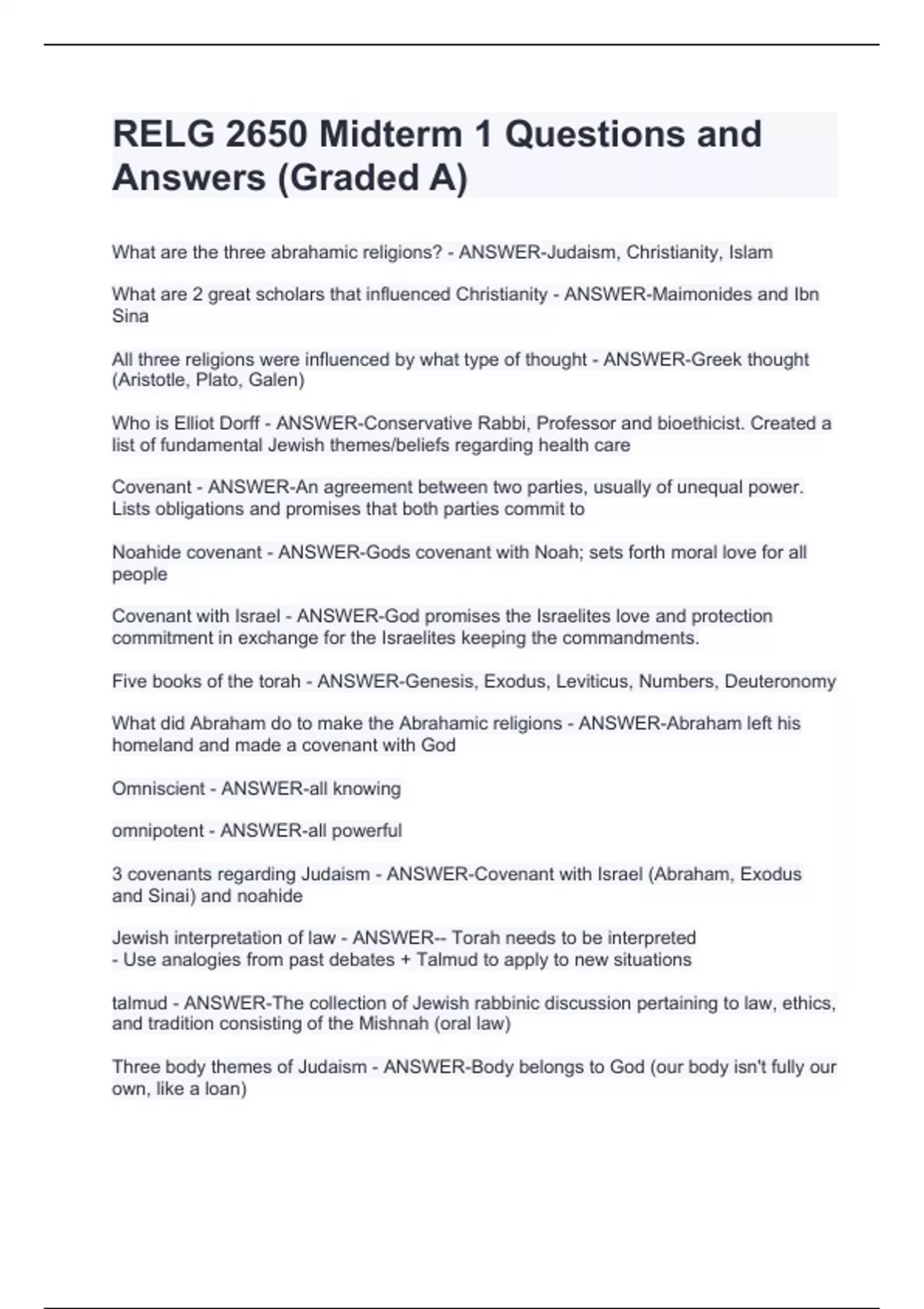 RELG 2650 Midterm 1 Questions and Answers (Graded A)RELG 2650 Midterm 1 Questions and Answers (Graded A)RELG 2650 Midterm 1 Questions and Answers (Graded A) What are the three abrahamic religions? - ANSWER-Judaism, Christianity, Islam What are 2 great scholars that influenced Christianity - ANSWER-Maimonides and Ibn Sina All three religions were influenced by what type of thought - ANSWER-Greek thought (Aristotle, Plato