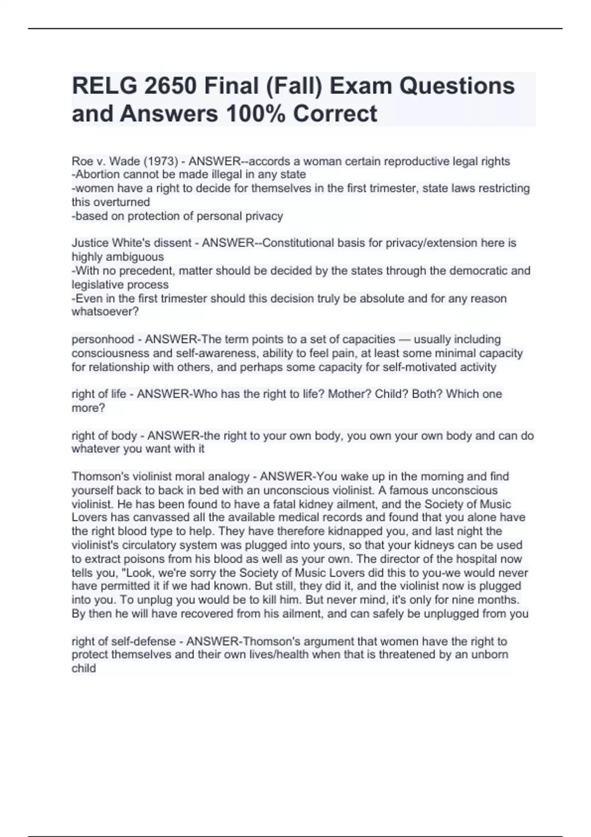 RELG 2650 Final (Fall) Exam Questions and Answers 100% CorrectvRELG 2650 Final (Fall) Exam Questions and Answers 100% CorrectRELG 2650 Final (Fall) Exam Questions and Answers 100% CorrectRoe v. Wade (1973) - ANSWER--accords a woman certain reproductive legal rights -Abortion cannot be made illegal in any state -women have a right to decide for themselves in the first trimester, state laws restricting this overturned -based on protection of personal privacy Justice White's dissent - ANSWER--Constitutional basis for privacy/extension here is highly ambiguous -With no precedent, matter should be decided by the states through the democratic and legislative process -Even in the first trimester should this decision truly be absolute and for any reason whatsoever? personhood - ANSWER-The term points to a set of capacities — usually including consciousness and self-awareness, ability to feel pain, at least some minimal capacity