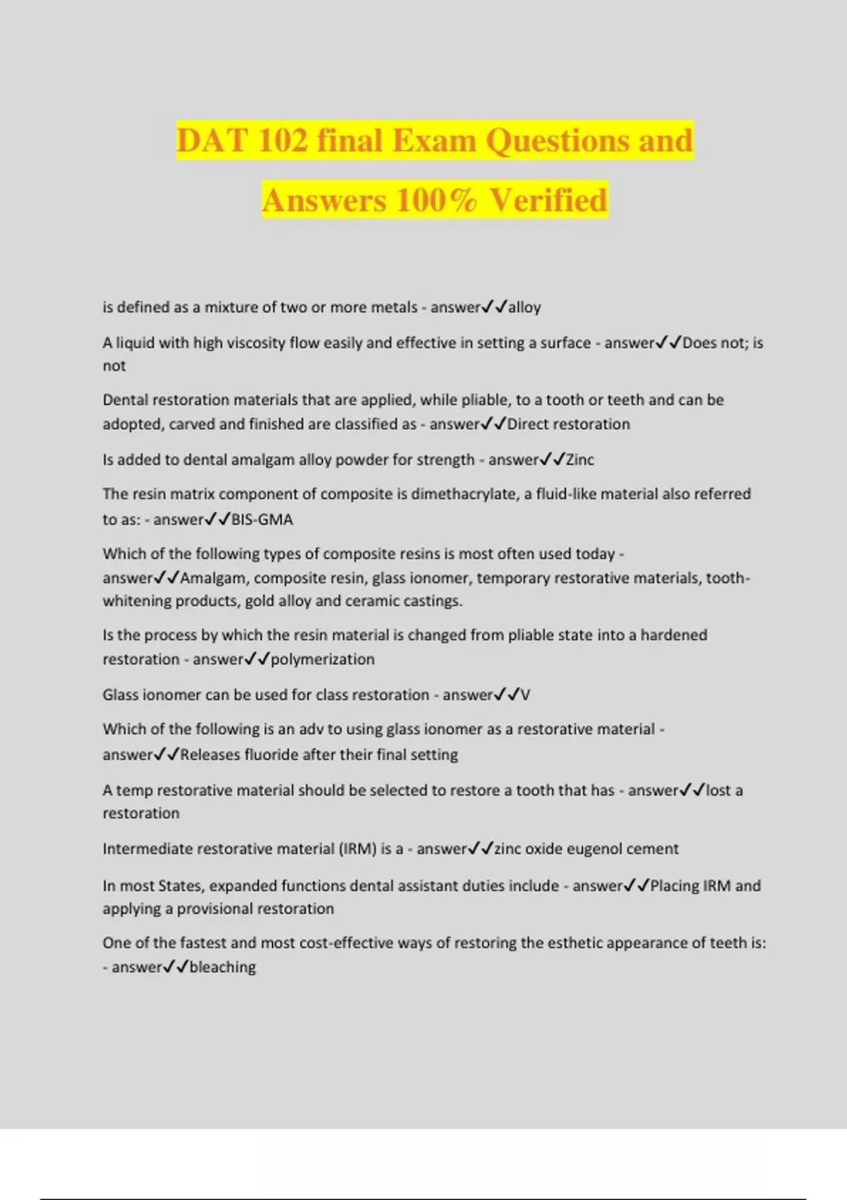 DAT 102 final Exam Questions and Answers 100% Verified is defined as a mixture of two or more metals - answeralloy A liquid with high viscosity flow easily and effective in setting a surface - answerDoes not; is not Dental restoration materials that are applied, while pliable, to a tooth or teeth and can be adopted, carved and finished are classified as - answerDirect restoration Is added to dental amalgam alloy powder for strength - answerZinc The resin matrix component of composite is dimethacrylate, a fluid-like material also referred to as: - answerBIS-GMA Which of the following types of composite resins is most often used today - answerAmalgam, composite resin, glass ionomer, temporary restorative materials, tooth- whitening products, gold alloy and ceramic castings. Is the process by which the resin material is changed from pliable state into a hardened restoration - answerpolymerization Glass ionomer can be used for class restoration - answerV Which of the following is an adv to using glass ionomer as a restorative material - answerReleases fluoride after their final setting A temp restorative material should be selected to restore a tooth that has - answerlost a restoration Intermediate restorative material (IRM) is a - answerzinc oxide eugenol cement In most States, expanded functions dental assistant duties include - answerPlacing IRM and applying a provisional restoration One of the fastest and most cost-effective ways of restoring the esthetic appearance of teeth is: - answerbleaching Which of the following statements is true of the composition of tooth whiting materials - answerWhen the product contacts the tooth it allows oxygen to enter the enamel and dentin which whitens the colored surface. The dental restoration created in the lab by the dental lab tech are classified as - answerIndirect restoration A noble metal used for cast restoration in dentistry is - answerPalladium The type of ceramic most often used in dentistry for casting is - answerporcelain The term 'restorative' describes the ability to: - answerRemove disease and restore function Before they can be marked, new dental materials must undergo strict evaluation by the - answerADA criteria for new restorative materials states that the material must be - answerAll of above Material used to restore posterior teeth must be capable of withstanding psi - answer28,000 Occurs when a metal restoration is touched by a fork - answergalvanic action Corrosion of metal restorative materials - answer-is a reaction that occurs when metal is exposed to products such as temperature humidity and saline -is easily removed with polishing agents For adhesion to take place, film thickness is desired - answerThin The process of setting material is correctly referred to as - answerCuring The curing process in which it is the most critical that the materials are mixed and placed within the working and setting times is with ________ materials. - answerAuto-cu