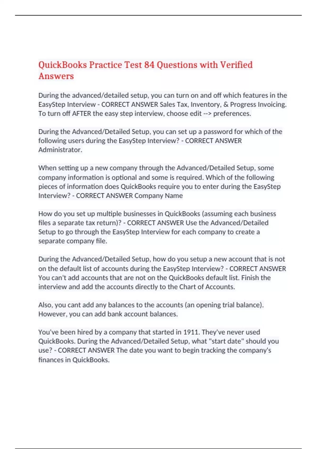 QuickBooks Practice Test 84 Questions with Verified Answers During the advanced/detailed setup, you can turn on and off which features in the EasyStep Interview - CORRECT ANSWER Sales Tax, Inventory, & Progress Invoicing. To turn off AFTER the easy step interview, choose edit -- preferences. During the Advanced/Detailed Setup, you can set up a password for which of the following users during the EasyStep Interview? - CORRECT ANSWER Administrator. When setting up a new company through the Advanced/Detailed Setup, some company information is optional and some is required. Which of the following pieces of information does QuickBooks require you to enter during the EasyStep Interview? - CORRECT ANSWER Company Name How do you set up multiple businesses in QuickBooks (assuming each business files a separate tax return)? - CORRECT ANSWER Use the Advanced/Detailed Setup to go through the EasyStep Interview for each company to create a separate company file. During the Advanced/Detailed Setup, how do you setup a new account that is not on the default list of accounts during the EasyStep Interview? - CORRECT ANSWER You can't add accounts that are not on the QuickBooks default list. Finish the interview and add the accounts directly to the Chart of Accounts. Also, you cant add any balances to the accounts (an opening trial balance). However, you can add bank account balances. You've been hired by a company that started in 1911. They've never used QuickBooks. During the Advanced/Detailed Setup, what "start date" should you use? - CORRECT ANSWER The date you want to begin tracking the company's finances in QuickBooks. You should use the date for which you have accurate starting balances. If the date is in the past, you will have to enter transactions that have occurred up to that point. How do you restore a company file from a backup copy? - CORRECT ANSWER File -- Open or Restore Company -- Restore a Backup Copy -- Next -- Local or Online Backup -- Next -- Select the file to restore -- Open -- choose where to restore the file to -- Save What is a backup option in QuickBooks? - CORRECT ANSWER Manually back up the file; Automatically back up the data file when closing QuickBooks; Schedule an unattended backup. Why would you restore a data file from the backup file? - CORRECT ANSWER You wish to review the company data as it stood at an earlier date; The company data file on your hard drive is damaged and cannot be used; Your computer crashed. You reloaded QuickBooks, and now you are ready to open the company file. How do you switch to Multi-User Mode? - CORRECT ANSWER File -- Switch to Multi-User Mode If you choose to remove transactions as of a specific date from the "Condense Data" window, what does QuickBooks do? - CORRECT ANSWER Removes all transactions while leaving list, preferences, and service subscriptions intact. What happens when you press F2 in QuickBooks? - CORRECT ANSWER QuickBooks opens the Product Information window which includes version and company file information. If the computer that houses your QuickBooks data crashes, what should you do? - CORRECT ANSWER Restore a back up copy of your company file When you start a company or are hired as a bookkeeper, it is important to know which edition of QuickBooks you are using. What are the major QuickBooks editions? - CORRECT ANSWER QuickBooks Online, QuickBooks Pro, QuickBooks Premier, QuickBooks Enterprise Solutions. When entering a journal entry, what happens if the debits don't equal the credits? - CORRECT ANSWER QuickBooks will not allow you to record the transaction. What do the diamonds mean on certain lists (for example, the diamonds to the left of each Customer:Job)? - CORRECT ANSWER You can click on the diamond and move the list entry to a different location on the list If you moved a list entry up or down, what happens when you add a new entry to the list? - CORRECT ANSWER QuickBooks adds new list entries to the top of the list, regardless of alphabetic order What is the maximum number of names that can be included on the Names lists in QuickBooks Pro or Premier? - CORRECT ANSWER 14,500 What keyboard shortcut allows you to see a total for all four names lists? - CORRECT ANSWER F2 How do you combine or merge two list entries? - CORRECT ANSWER Rename the unwanted list entry to match the name of the list entry you want to merge into. There are some cases where you can't merge or combine entries. You can't merge entries of different "type" Can you delete a list entry (for example, an item)? - CORRECT ANSWER Yes, if the list entry is not used in any transactions or is not part of another list entry (for example, a group item) No, if the list entry is used in any transactions or is part of another list entry (for example, a group item) Suppose you own a company that repairs bicycles. What item type should you use for "bicycle repair"? - CORRECT ANSWER Service Which is NOT an Item Type? - CORRECT ANSWER Income What is true concerning items? - CORRECT ANSWER You can use one item to represent different services or goods. Items allow you to track your sales in more detail without cluttering your Chart of Accounts or Profit & Loss. To create an invoice, you must use an item. What are other benefits of using items? - CORRECT ANSWER You can track the actual quantity of goods or services you sell. They can save you time by automatically entering a description and price on forms. They allow you to track a lot of detail without cluttering your Chart of Accounts. What item type should you use for inventory that you assemble form other items and then sell? - CORRECT ANSWER Inventory assembly You've just been hired by a bakery that sells cupcakes. When they buy ingredients, they use the Expense tab and assign the costs to a Cost of Goods Sold account. you need to set up an item for cakes. What item type should you use? - CORRECT ANSWER Non-Inventory Part What account (on the Chart of Accounts) is affected when you sell an item? - CORRECT ANSWER The