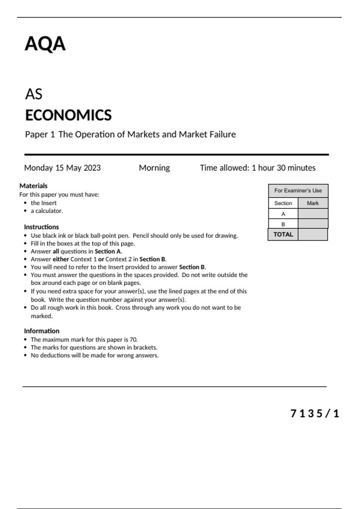 AQA AS Level Economics paper 1 QUESTION PAPER for June 2023- 7 1 3 5/1