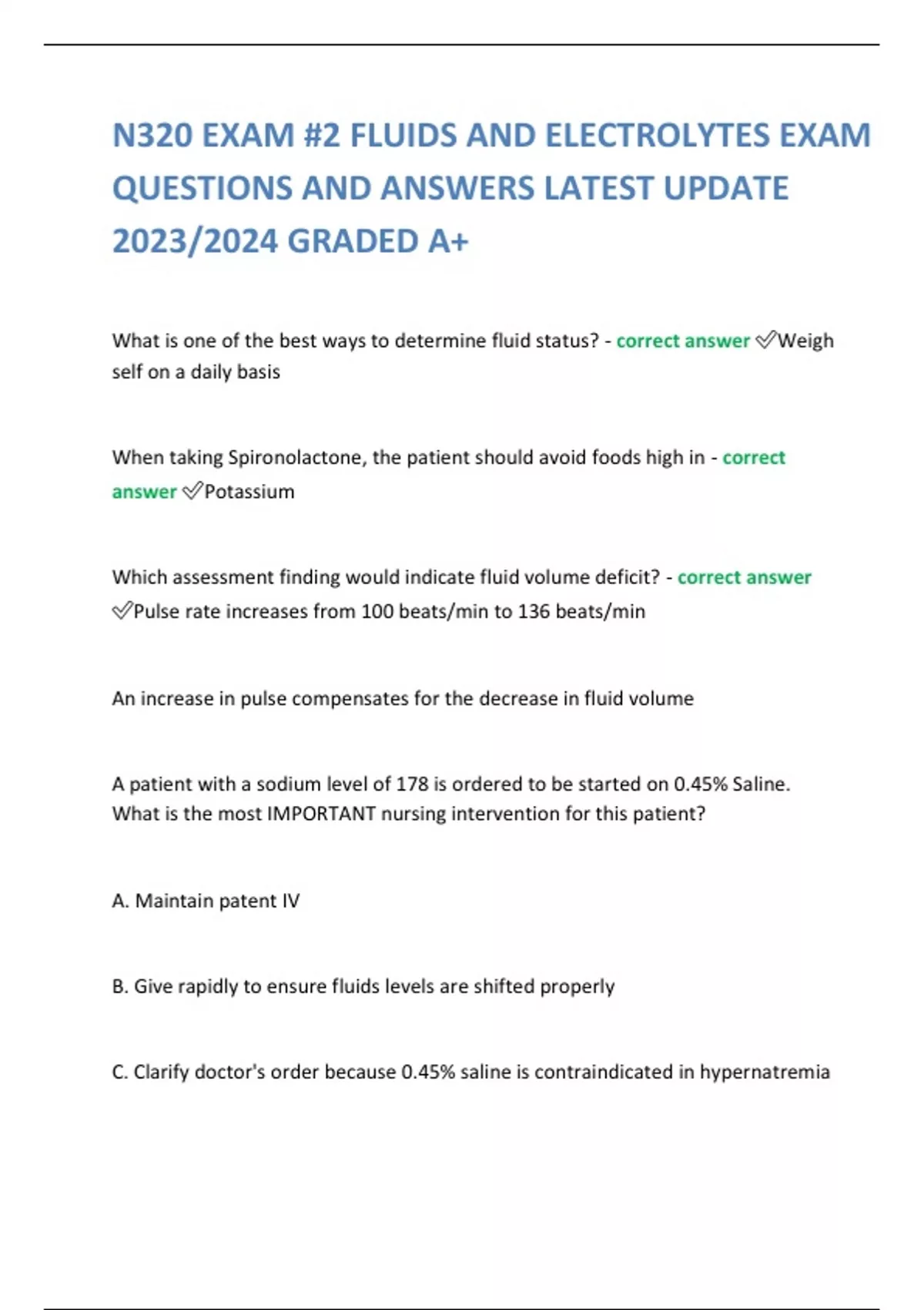 N320 EXAM #2 FLUIDS AND ELECTROLYTES EXAM QUESTIONS AND ANSWERS LATEST UPDATE GRADED A+