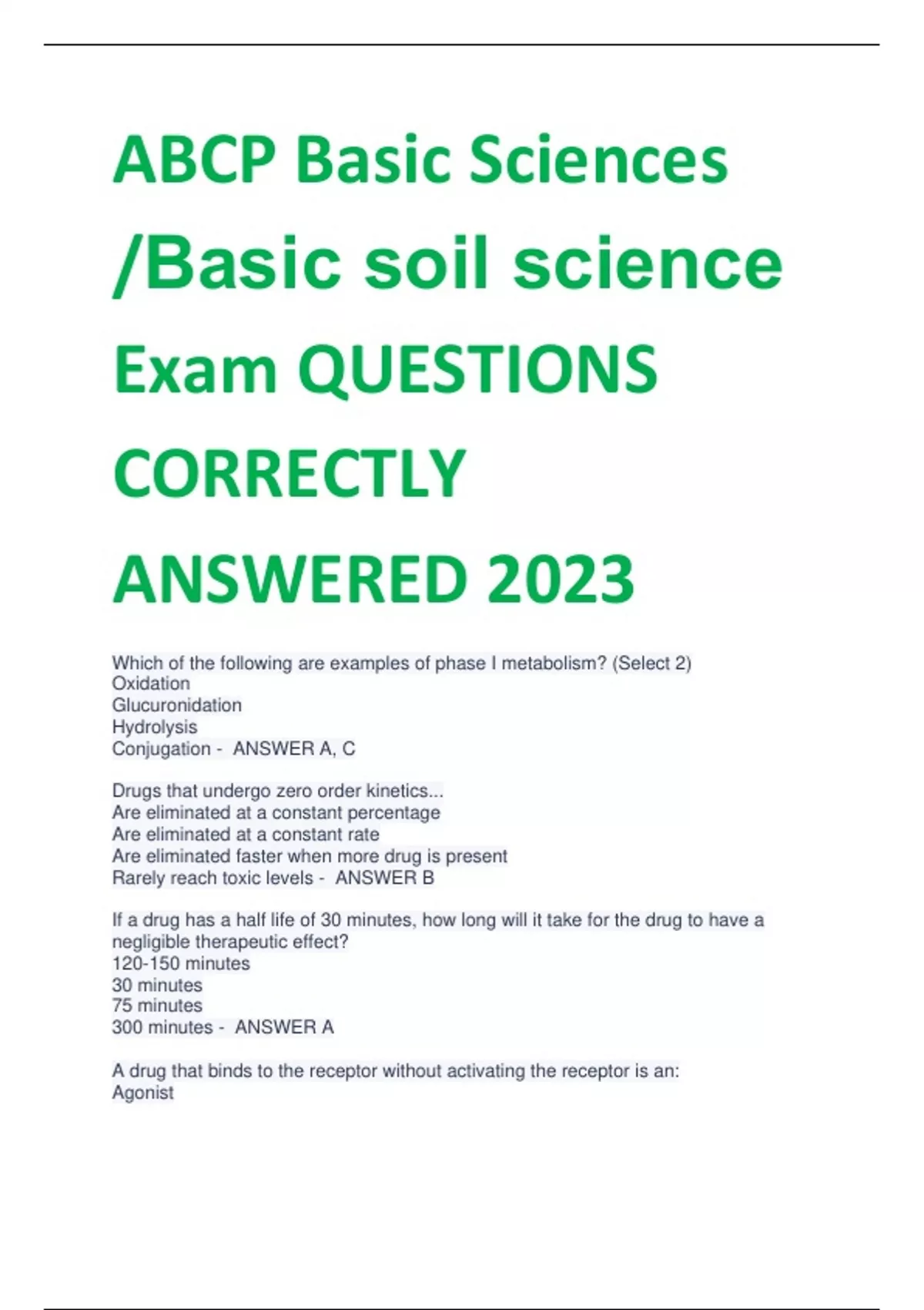 ABCP Basic Sciences /Basic soil science Exam QUESTIONS CORRECTLY ANSWERED 2024 Which of the following are examples of phase I metabolism? (Select 2) Oxidation Glucuronidation Hydrolysis Conjugation - ANSWER A, C Drugs that undergo zero order kinetics... Are eliminated at a constant percentage Are eliminated at a constant rate Are eliminated faster when more drug is present Rarely reach toxic levels - ANSWER B If a drug has a half life of 30 minutes, how long will it take for the drug to have a negligible therapeutic effect? 120-150 minutes 30 minutes 75 minutes 300 minutes - ANSWER A A drug that binds to the receptor without activating the receptor is an: Agonist Partial agonist Agonist-antagonist Antagonist - ANSWER D Which of the following are inhibitory neurotransmitters? (Select 2) GABA Glutamate Serotonin Glycine Acetylcholine - ANSWER A, D Which part of the local anesthetic structure determines the type/class of local anesthetic? Lipophilic aromatic ring Hydrophilic tail Intermediate chain There is only one class of local anesthetic - ANSWER C A local anesthetic exerts its action on which part of the body? Plasma membrane Inner portion of the Na channel Mitochondria Cytoplasm - ANSWER B The pKa of a local anesthetic helps to determine the___ Potency Duration of action Rate of uptake Onset of action - ANSWER D Which type of nerve fiber is affected by a local anesthetic first? C fiber A gamma fiber A alpha fiber A beta fiber B fiber - ANSWER E How is ropivacaine metabolized? Plasma cholinesterase Liver metabolism Renal excretion completely unchanged Acetylcholinesterase - ANSWER B A 90 kg patient is receiving an interscalene block and starts complaining of visual disturbances and begins twitching. What action should you immediately take? Transfer patient to cardiac OR for emergent cardiopulmonary bypass Administer 50 mcg of epinephrine Administer 135 mL of lipid emulsion