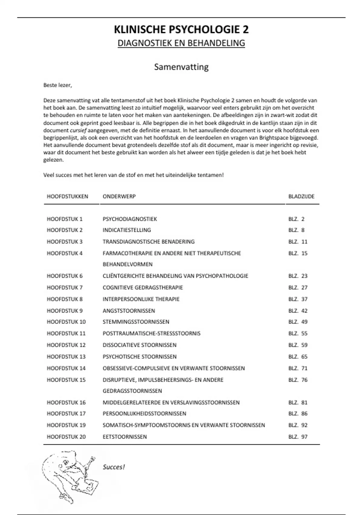 Deze samenvatting bestaat uit twee documenten: één voor studeren en één voor revisie. Koop de bundel die is even duur! Stuvia laat mij niet twee documenten uploaden onder één naam, vandaar dat ik ze heb gebundeld voor dezelfde prijs als één document. Dit is dé samenvatting van het vak klinische psychologie diagnostiek en behandeling gegeven aan de Open Universiteit. Het is een complete samenvatting gebaseerd op het bijbehorende boek van Ellin Simon, Eva de Hullu, Guus Smeets en Henk T. van der Molen - Derde druk uit 2018. In deze samenvatting komen alle hoofdstukken die de tentamenstof vormen in naar voren en deze verschaft genoeg informatie om het vak met een goed cijfer af te ronden. De samenvatting bestaat uit twee documenten: een vormt een samenvatting die de indeling van het boek aanhoudt en gebruikt kan worden om de stof (opnieuw) tot je te nemen. Het tweede document is bedoeld voor revisie en bevat voor elk hoofdstuk een overzicht van de onderwerpen die aan bod komen, een begrippenlijst en de leerdoelen en vragen van Brightspace. De samenvatting is 97 pagina's lang, het revisiedocument 106 pagina's. Veel succes met je tentamen!