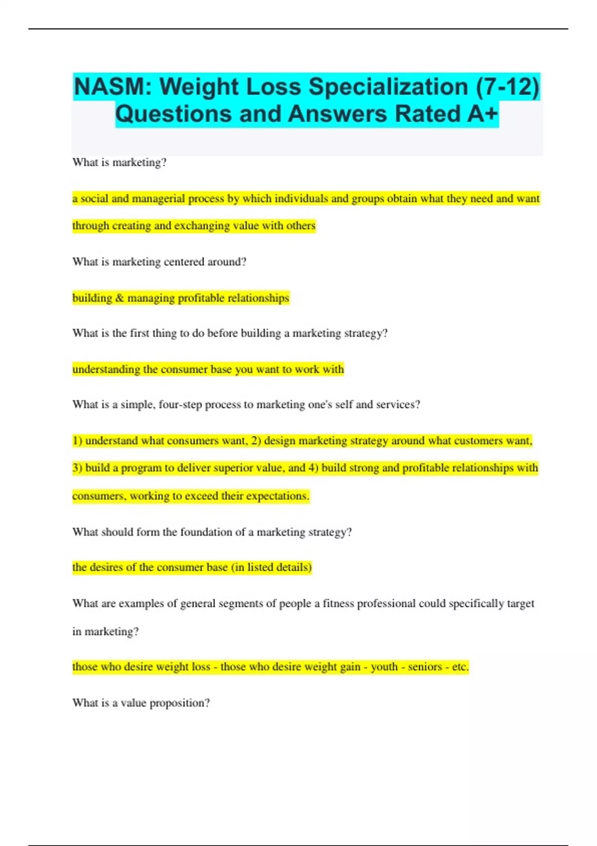 NASM: Weight Loss Specialization (7-12) Questions and Answers Rated A+ What is marketing? a social and managerial process by which individuals and groups obtain what they need and want through creating and exchanging value with others What is marketing centered around? building & managing profitable relationships What is the first thing to do before building a marketing strategy? understanding the consumer base you want to work with What is a simple, four-step process to marketing one's self and services? 1) understand what consumers want, 2) design marketing strategy around what customers want, 3) build a program to deliver superior value, and 4) build strong and profitable relationships with consumers, working to exceed their expectations. What should form the foundation of a marketing strategy? the desires of the consumer base (in listed details) What are examples of general segments of people a fitness professional could specifically target in marketing? those who desire weight loss - those who desire weight gain - youth - seniors - etc. What is a value proposition? the set of benefits or values the professional promises to deliver to consumers to satisfy their needs; a statement which provides the reason why a customer should buy your services What basic steps are involved in preparing a marketing plan? determining price, place, and promotion method What are three keys to building a a healthy relationship in marketing? effective & open communication - superior customer service - professionalism How does a fitness professional determine the price of their services? determining the overhead costs & assessing what their market will bear What is the purpose of "promotion"? to communicate the benefits of your product and persuade a client to purchase your services What is the most important step in marketing for fitness professionals? building customer relationships What are some "dos" for effective communication with a weight loss client? inform potential clients of the overall health benefits of increasing physical activity - address long and short-term goals - describe how a typical session will go - inform the client of expectations that exist outside of training sessions - establish frequency of reassessments - encourage questions to better understand the client's expectations - show the client a workout template What are some "don'ts" for effective communication with a weight loss client? don't use complicated language - don't make promises you might not be able to keep, using words such as "guarantee" - don't talk about results coming quickly or easily - don't encourage unrealistic expectations What are some keys for superior customer service? Greet - Inform - Inspire Care - Educate - Motivate When it comes to diet and nutrition advice, what is within the scope of practice for a fitness professional? Providing general, non medical nutrition information - Referring clients to a registered dietitian (RD) - Having a client fill out a Physical Activity Readiness Questionnaire (PAR-Q) Unlike a personal trainer certification, what characterizes the licensure of a Registered Dietician? legally protected & authorized by the Commission of Dietetic Registration What is a board-certified specialist in sports dietetics (CSSD)? A registered dietitian with a minimum of 2 years of professional practice experience - A specialist in sports nutrition qualified to deliver medical nutrition therapy - Nationally certified by the Commission in Dietetic Registration What does the acronym S.O.A.P. stand for? Subjective, Objective, Assessment, Plan What is the primary purpose of the S.O.A.P. note? to document transactions and client participation T/F: Laws exists in almost every state that allow fitness professionals to prescribe nutrition counseling (medical nutrition therapy). False: Laws exist in almost every state that limit the practice of medical nutrition therapy to licensed or registered dietitians or nutritionists and specific health care professionals. What is the organization that authorizes registered dietitians in the United States? Commission on Dietetic Registration (CDR) - which is the credentialing organization of the Academy of Nutrition and Dietetics T/F: Teaching about the difference between saturated and unsaturated fats lies within the scope of practice of a fitness professional. True (general, non medical nutrition information) What are two tools fitness professionals should be using in giving nutrition advice? Nutrition facts panels & the Dietary Guidelines for Americans What are some key questions to ask in order to determine if a fitness professional should refer their client to a specialist? 1) Could this person be better helped by someone with more (or different) expertise? 2) Does this person's nutrition concern fall outside the realm (physically and/or psychologically) of a healthy individual? 3) Do I feel any discomfort with my ability to help this person? What documentation(s) provides helpful information from a fitness professional about a client to a health professional? S.O.A.P & PAR-Q When performing assessments on clients who are overweight, the fitness professional should... ...use a private or semi-private location. If a client expresses sore muscles due to her