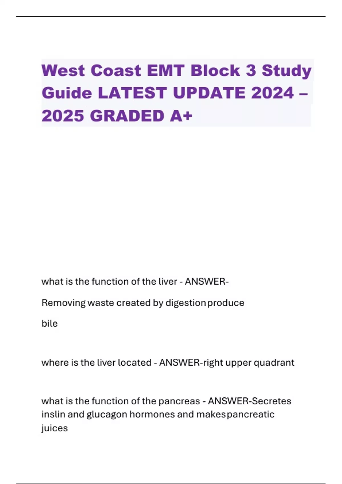 West Coast EMT Block 3 Study Guide LATEST UPDATE 2024 – 2025 GRADED A+ what is the function of the liver - ANSWERRemoving waste created by digestionproduce bile where is the liver located - ANSWER-right upper quadrant what is the function of the pancreas - ANSWER-Secretes inslin and glucagon hormones and makespancreatic juices where is the pancreas located - ANSWER-posterior to the stomach what is the function of the spleen - ANSWER-filter blood and help fight infections where is the spleen located - ANSWER-LUQ what is the function of the gallbladder - ANSWER-stores and concentrates bile Where is the gallbladder located? - ANSWER-under the liver, RUQ what are the three motor vehicle collisions - ANSWER-1. car against another car nger against interior of car nger's organs against solid structures of body what are arteries - ANSWER-Blood vessels that carry blood away from the heart what are arterioles - ANSWER-Arterioles are the smallest arteries
